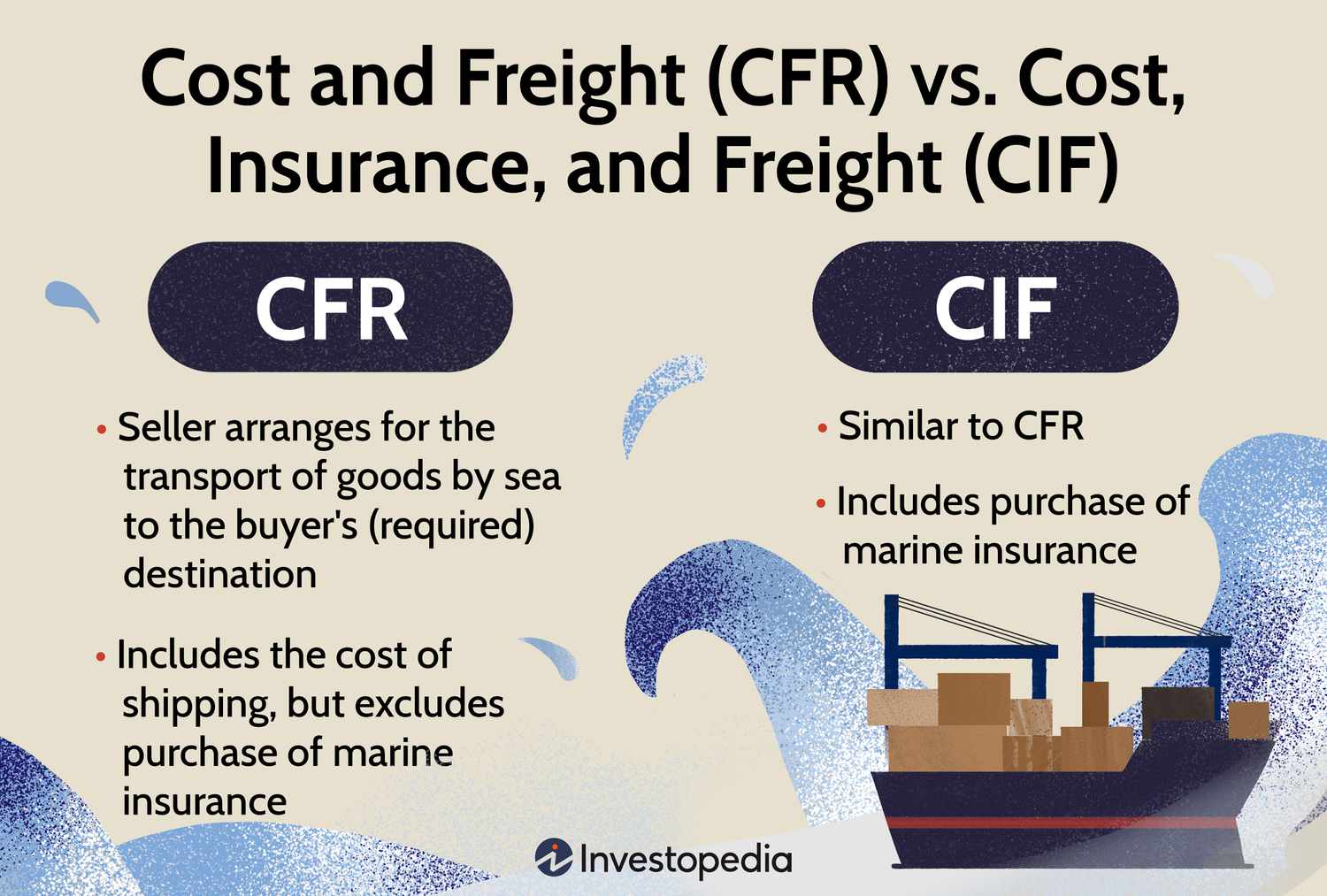 Le coût et le fret (CFR) est un terme commercial obligeant le vendeur à transporter les marchandises par voie maritime jusqu’au port souhaité. Elle couvre les frais hors assurance. Le coût, l’assurance et le fret (CIF) sont le montant qu’un vendeur doit payer pour couvrir les frais d’expédition ainsi que l’assurance pour se protéger contre la perte potentielle de la commande d’un acheteur.
