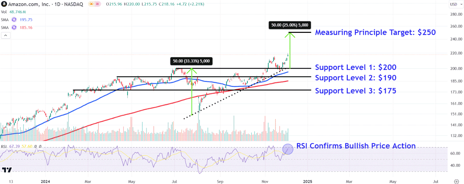 Revenons au graphique d’Amazon pour projeter les objectifs de prix potentiels et identifier trois niveaux de support clés qui pourraient attirer les achats en cas de baisse du titre.