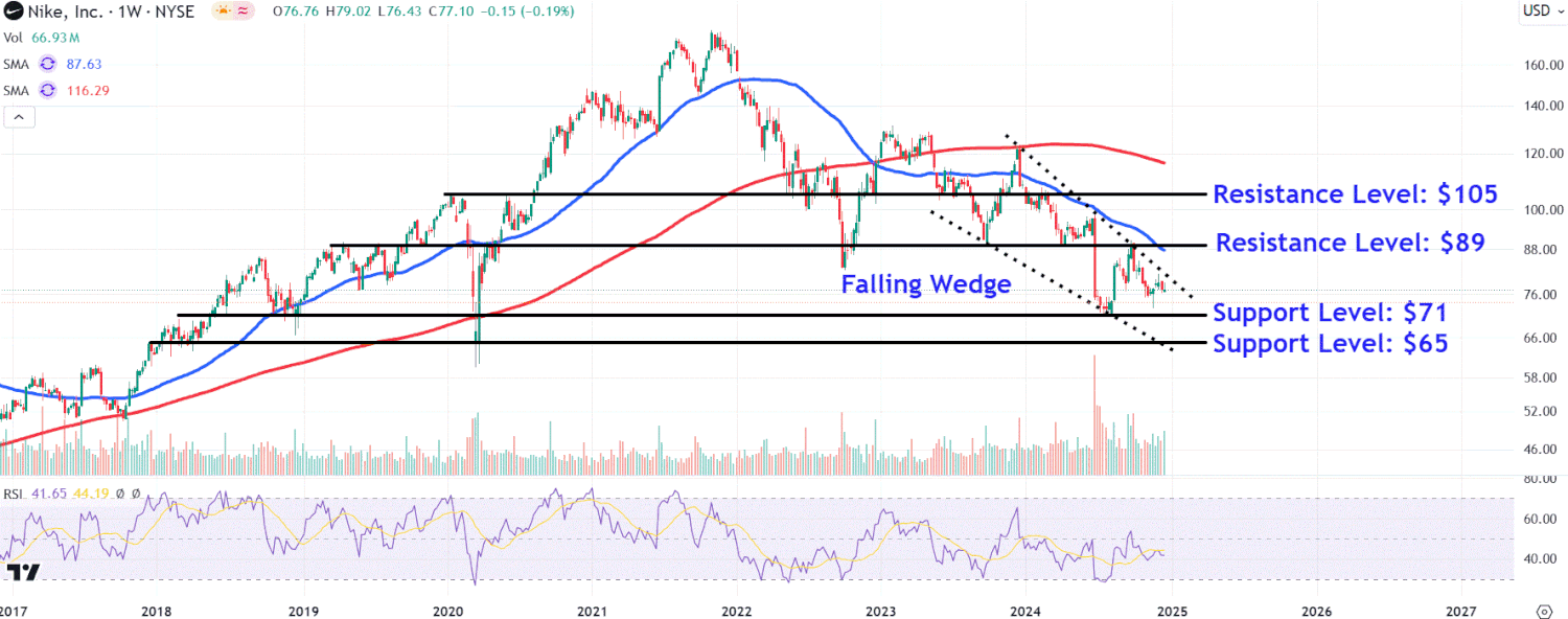 Ci-dessous, nous analysons les indicateurs techniques du graphique hebdomadaire de Nike pour identifier les principaux niveaux de prix post-bénéfice que les investisseurs peuvent surveiller.