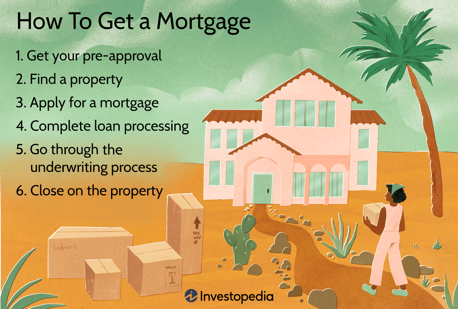 - Le processus hypothécaire est complexe mais peut être divisé en six étapes : pré-approbation, achat d’une maison, demande de prêt hypothécaire, traitement du prêt, souscription et clôture.