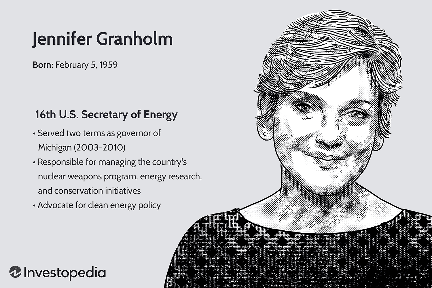 Jennifer Granholm a été nommée par l’ancien président Joe Biden au poste de secrétaire à l’Énergie des États-Unis en décembre 2020. Elle a été confirmée par le Sénat le 25 février 2021 et a prêté serment plus tard le même jour.