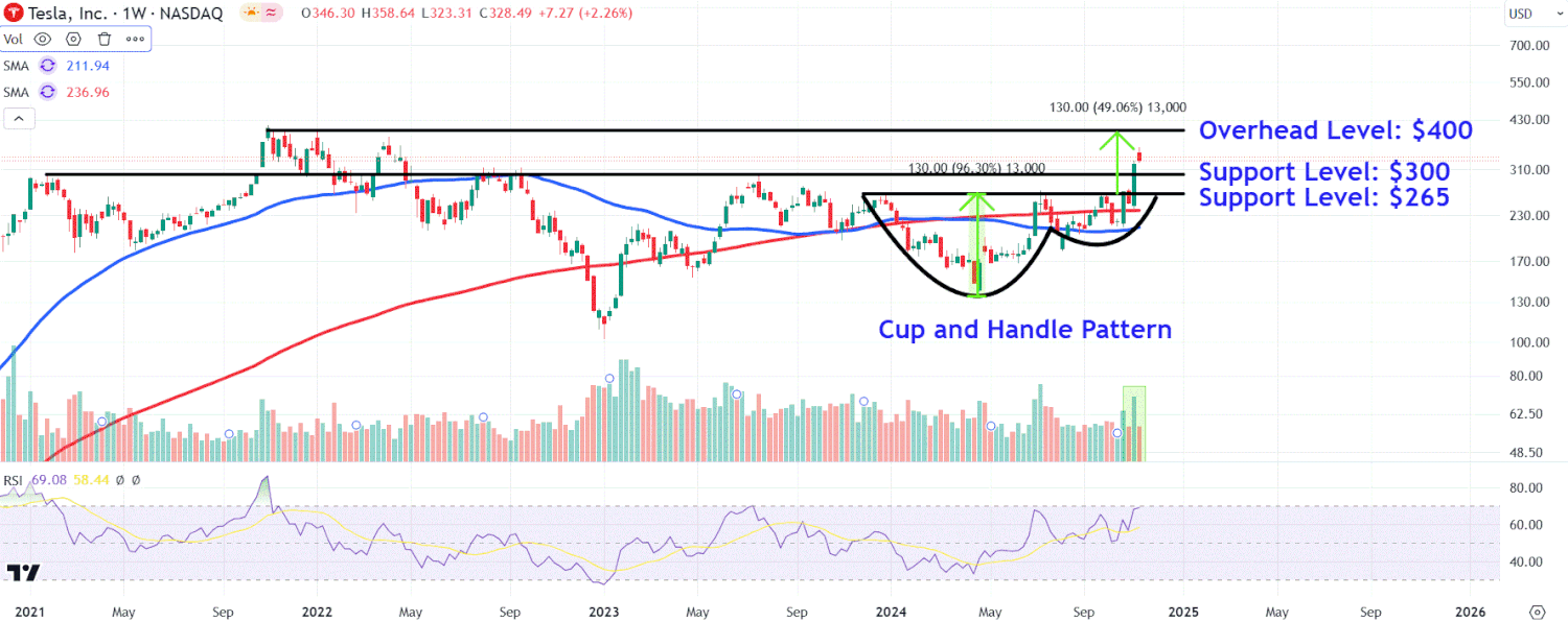 Ci-dessous, nous analysons les indicateurs techniques du graphique hebdomadaire de Tesla et soulignons les principaux niveaux de prix qui méritent d’être surveillés au milieu de la récente volatilité du titre due aux élections.