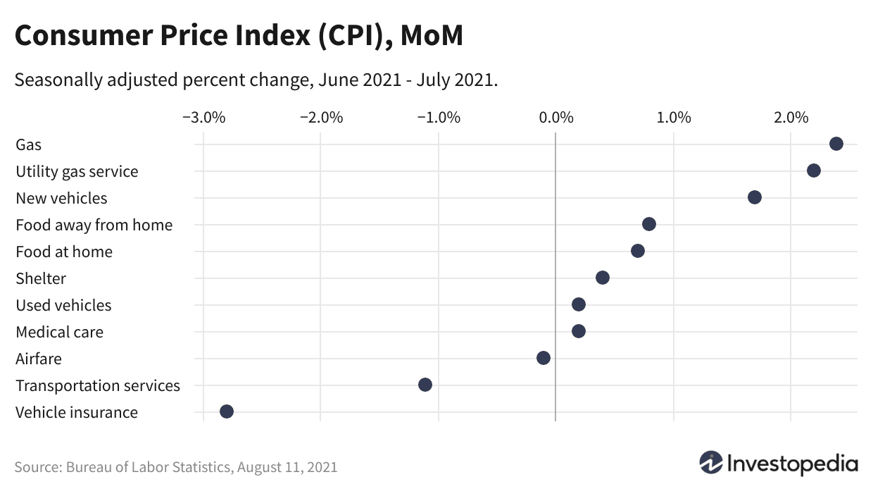 Le taux annuel de l’indice global est resté inchangé lors de la publication de juillet, l’IPC global ayant augmenté de 5,4 % d’une année sur l’autre, comme en juin, ce qui représente la plus forte augmentation d’une année sur l’autre depuis août 2008. Les prix de l’énergie et des véhicules d’occasion ont continué de mener les gains à long terme, avec les prix de l’essence en hausse de 41,8 %, les véhicules d’occasion en hausse de 41,7 % et les services publics de gaz en hausse de 19 % au cours du mois dernier. avec la même période l’année dernière. La plupart des autres catégories ont enregistré des hausses à un chiffre.