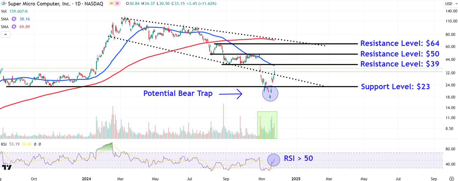 - Les investisseurs devraient surveiller les zones de résistance clés sur le graphique de Supermicro autour de 39 $, 50 $ et 64 $, tout en surveillant également le support clé proche de 23 $.