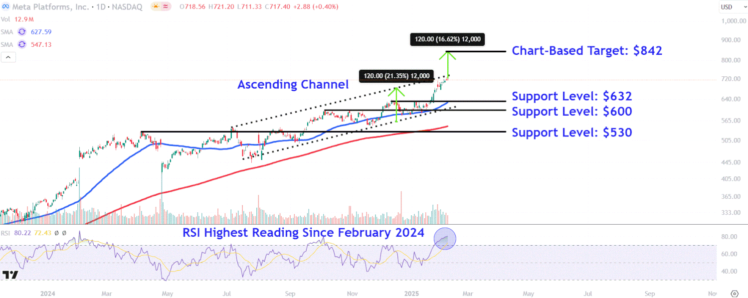Lorsqu’il est appliqué au graphique de Meta, nous calculons la distance entre la ligne de tendance inférieure et le haut du canal ascendant et ajoutons cette distance au haut du modèle. Dans ce cas, nous ajoutons 120 $ à 722 $, projetant un objectif de 842 $, 17 % au-dessus de la clôture de lundi, où les investisseurs pourraient chercher à sécuriser leurs bénéfices.