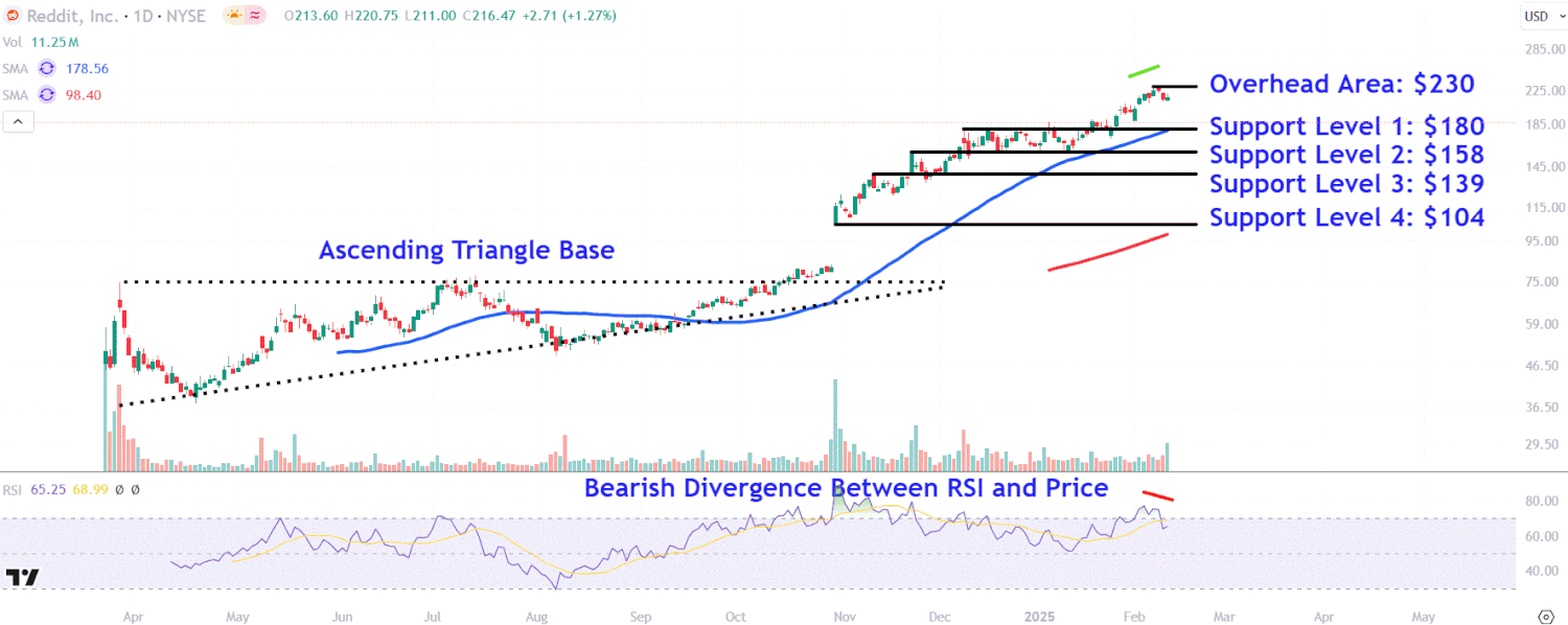 - Les investisseurs devraient surveiller les niveaux de support clés sur le graphique de Reddit autour de 180 $, 158 $, 139 $ et 104 $, tout en gardant un œil sur la zone clé proche de 230 $.