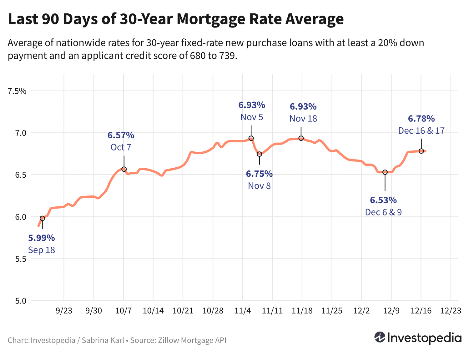 Les taux hypothécaires sont tombés en septembre à leur plus bas niveau depuis deux ans, mais ont ensuite augmenté à nouveau en octobre pour finalement atteindre un sommet sur quatre mois à 6,93 % en novembre. Même si la moyenne actuelle est inférieure, elle reste près de 90 points de base plus chère que le plus bas du 17 septembre de 5,89 %.