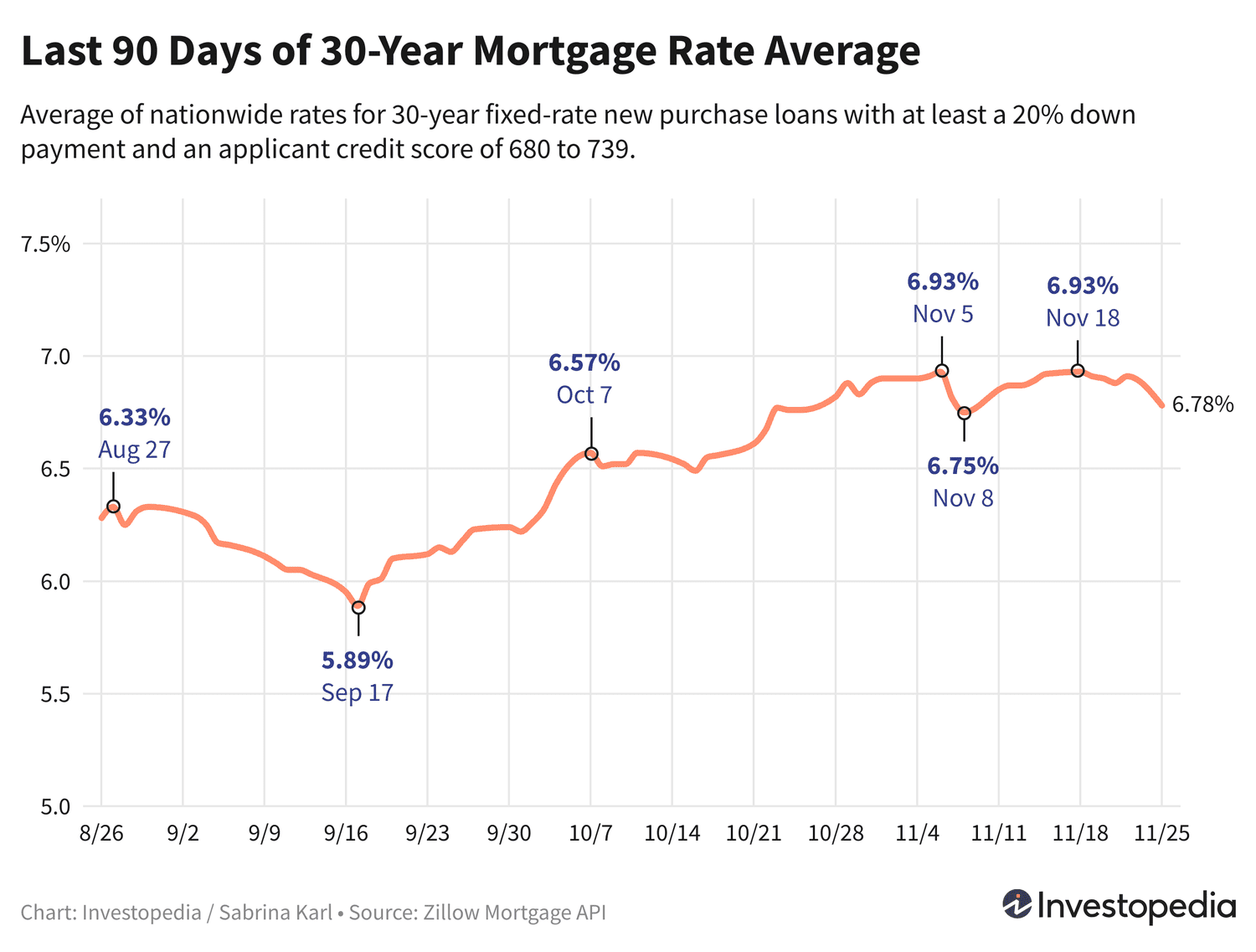 Après avoir oscillé dans une fourchette étroite et élevée au cours des deux dernières semaines, les taux hypothécaires à 30 ans ont finalement montré un mouvement important lundi, chutant d’un huitième de point de pourcentage pour atteindre une nouvelle moyenne de 6,78 %. Cela ramène les taux d’intérêt en dessous du récent sommet de quatre mois de 6,93 %. Alors que les taux hypothécaires sont tombés à leur plus bas niveau depuis deux ans en septembre, ils ont rebondi en octobre et sont restés plus élevés ce mois-ci.