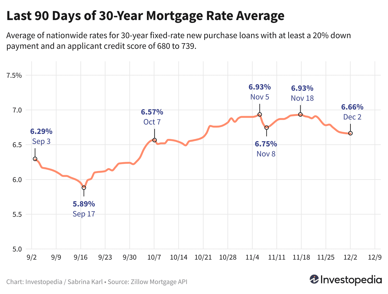 Alors que les taux hypothécaires ont chuté en septembre pour atteindre leur plus bas niveau depuis deux ans, ils ont de nouveau fortement augmenté en octobre pour finalement atteindre un sommet de quatre mois à 6,93 % en novembre. Même si la moyenne d’aujourd’hui est inférieure, elle reste néanmoins supérieure de 77 points de base au plus bas du 17 septembre, soit 5,89 %.