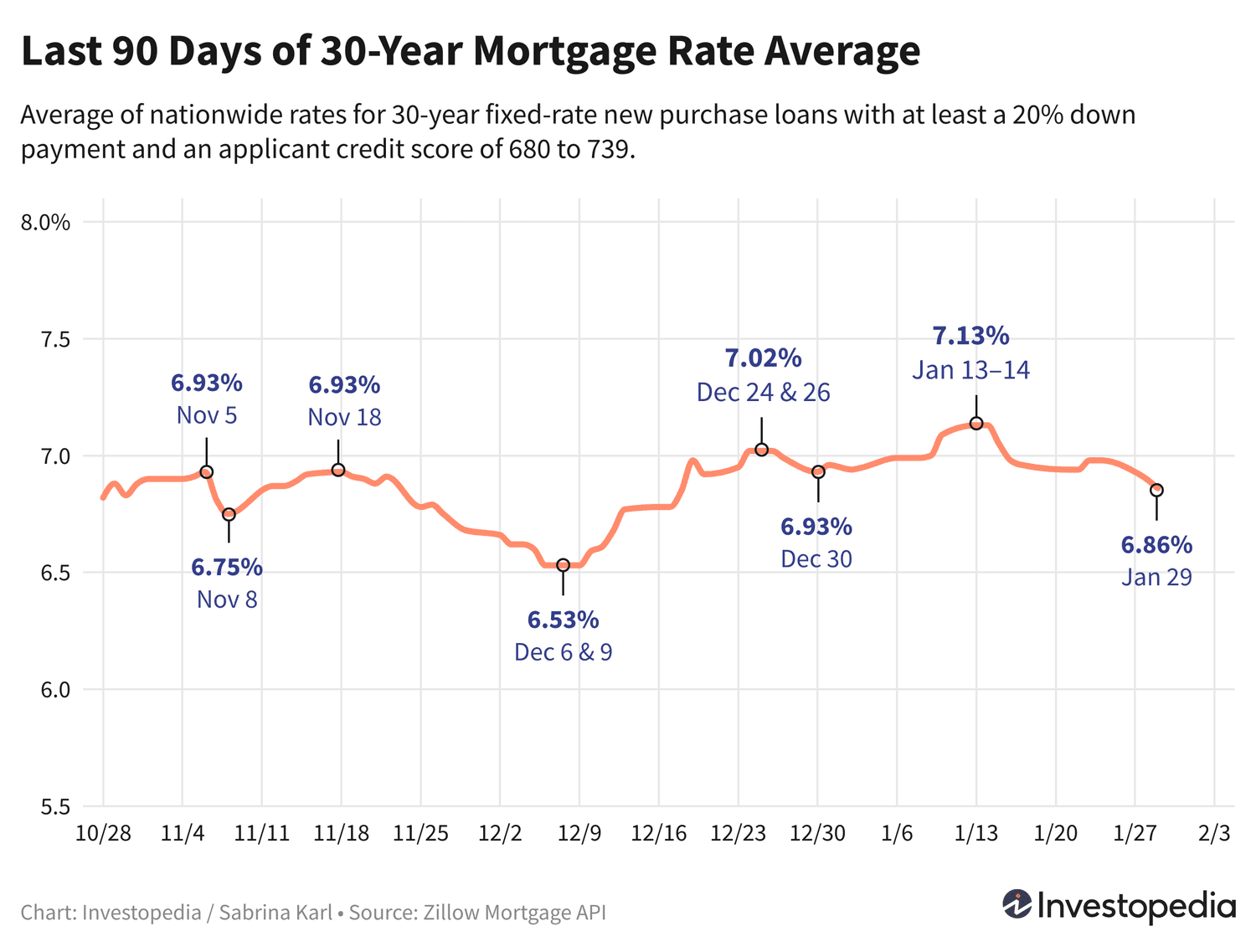 Les taux d’intérêt sur les nouveaux prêts hypothécaires d’achat à 30 ans ont diminué de 4 points de base mercredi. Cela a fait baisser la moyenne à 6,86% – le moins cher depuis le 18 décembre. Il y a deux semaines, la moyenne est passée à 7,13% – le plus cher depuis mai.