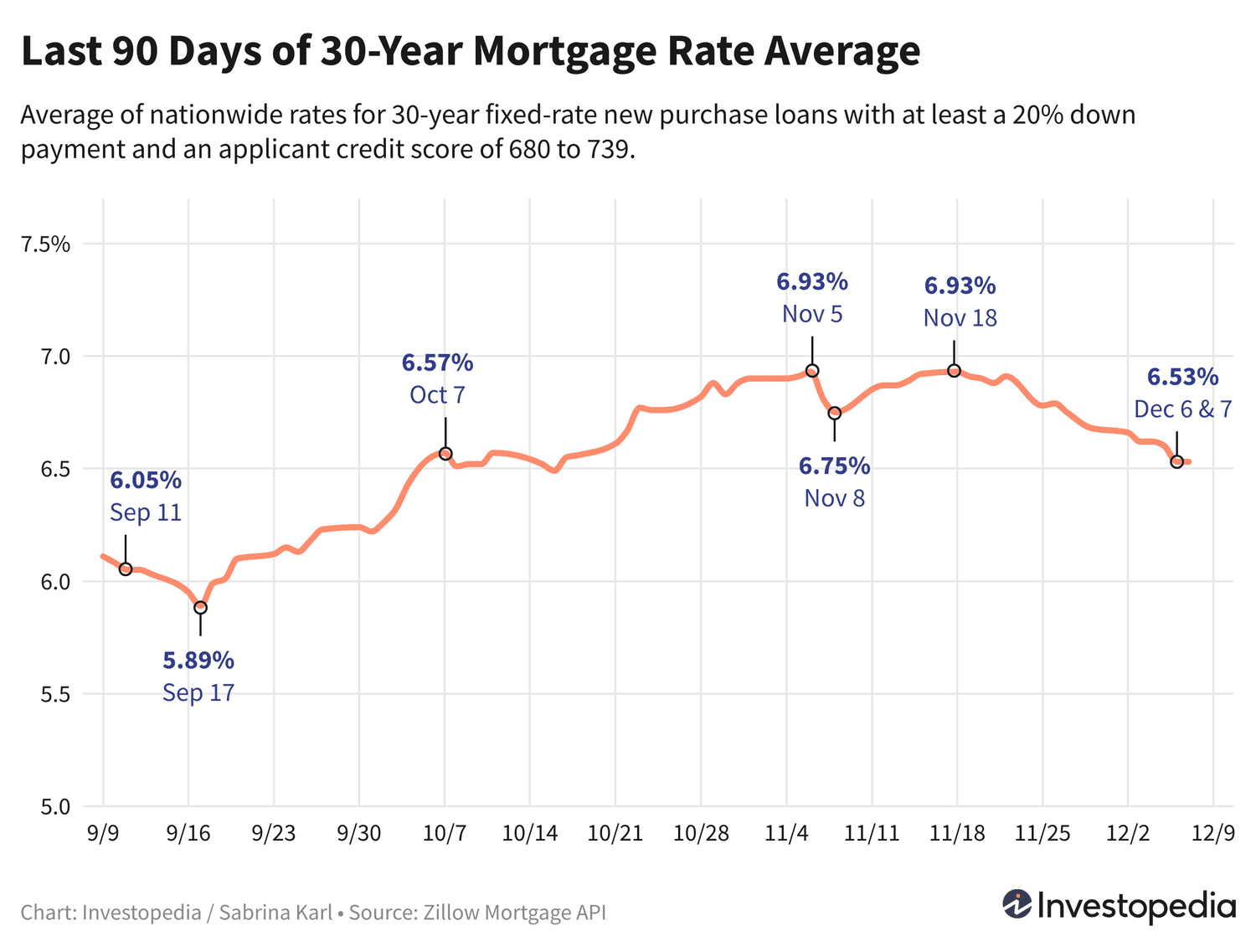 Alors que les taux hypothécaires ont chuté en septembre pour atteindre leur plus bas niveau depuis deux ans, ils ont de nouveau fortement augmenté en octobre pour finalement atteindre un sommet de quatre mois à 6,93 % en novembre. Même si la moyenne actuelle est inférieure, elle reste 64 points de base plus chère que le plus bas du 17 septembre de 5,89 %.