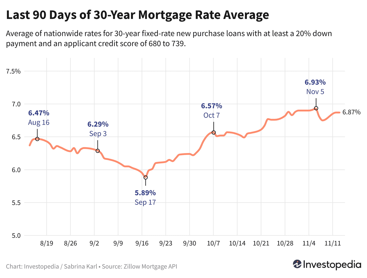Les taux d’intérêt sur les nouveaux prêts hypothécaires d’achat à 30 ans sont restés inchangés mercredi, après avoir augmenté de 12 points de base la veille. Cela laisse la moyenne supérieure à 6,87% – juste légèrement en dessous du pic de 6,93% de la semaine dernière, le plus élevé depuis le 3 juillet. La moyenne actuelle est de près d’un point de pourcentage supérieure au plus bas sur deux ans de septembre – lorsque la moyenne sur 30 ans est tombée à 5,89%.