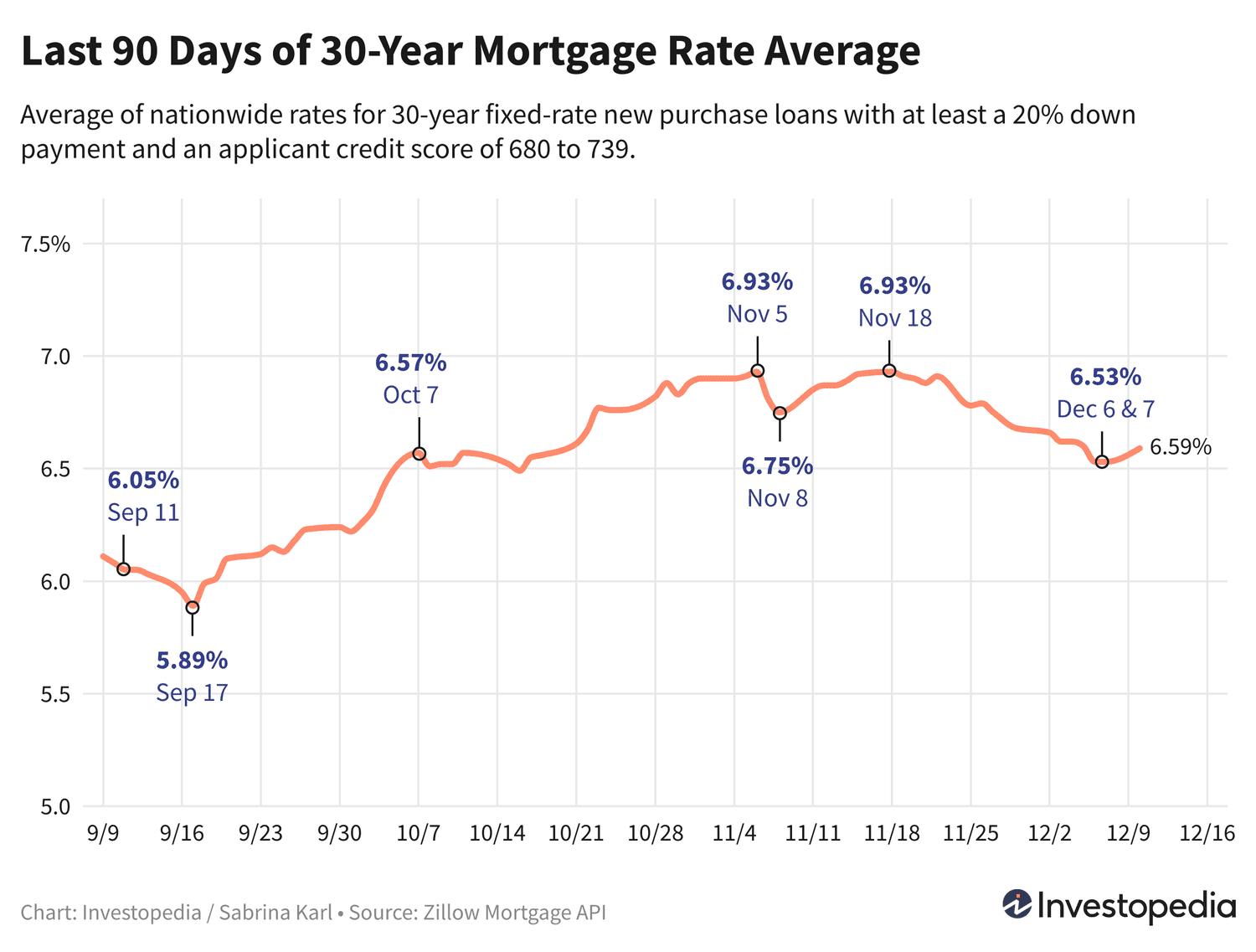 Alors que les taux hypothécaires ont chuté en septembre pour atteindre leur plus bas niveau depuis deux ans, ils ont de nouveau fortement augmenté en octobre pour finalement atteindre un sommet de quatre mois à 6,93 % en novembre. Même si la moyenne actuelle est inférieure, elle reste 70 points de base plus chère que le plus bas du 17 septembre de 5,89 %.