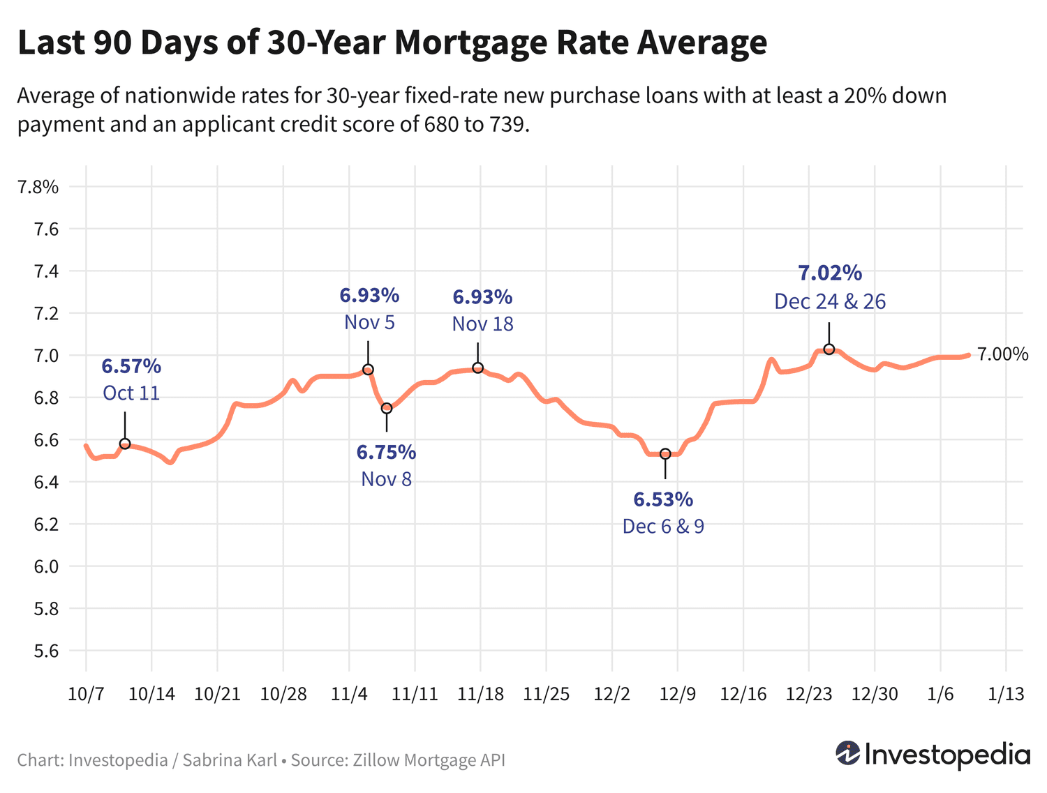 Le taux d’intérêt sur les nouveaux prêts hypothécaires d’achat sur 30 ans a ajouté un point de base jeudi, mais cela a suffi pour pousser la moyenne à un niveau notable de 7,00 %. C’est proche du sommet que nous avons connu il y a deux semaines, lorsque les taux d’intérêt ont atteint 7,02 %, soit la moyenne la plus élevée depuis le 2 juillet.