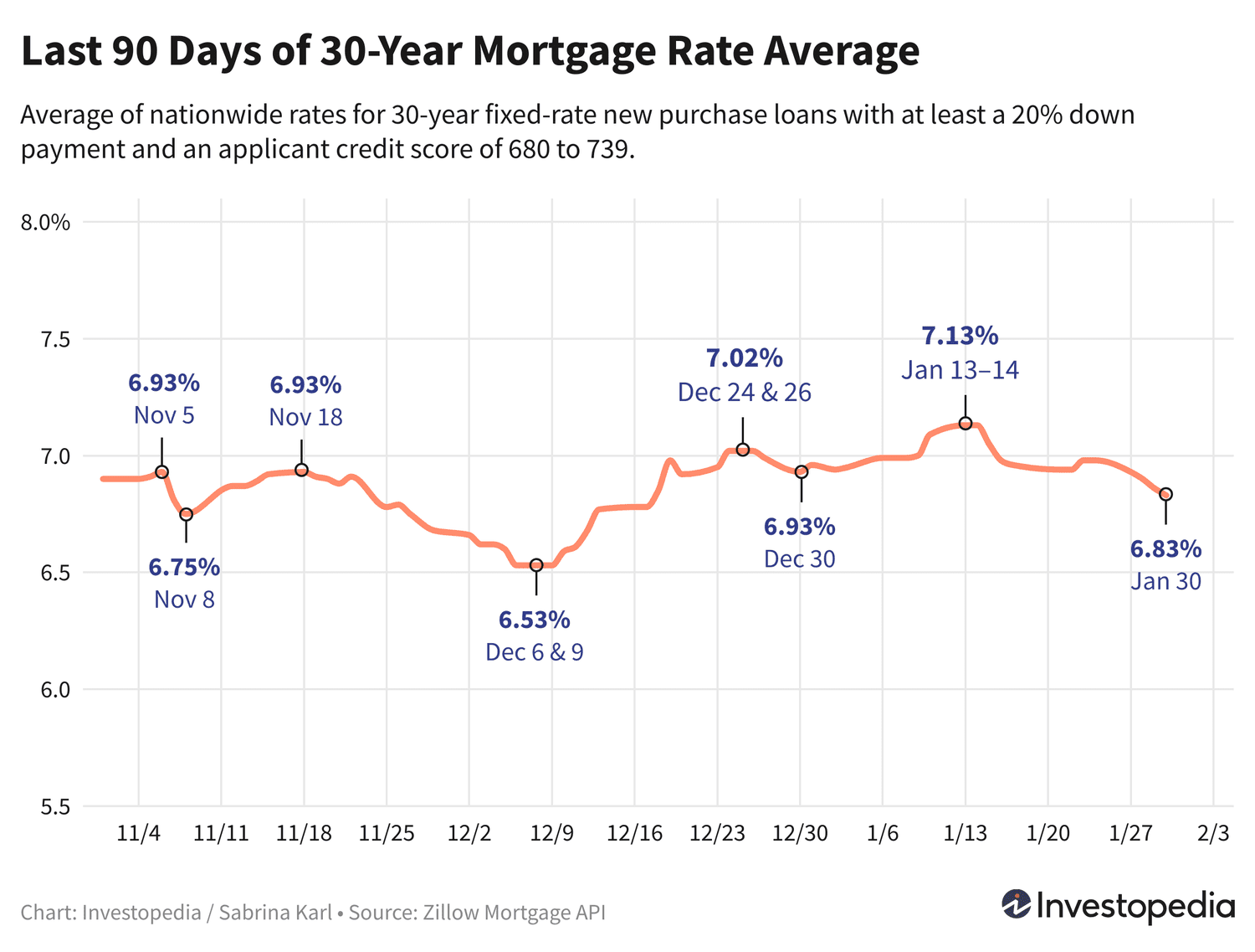 Les taux d’intérêt sur les nouveaux prêts hypothécaires à l’achat sur 30 ans ont diminué de 3 points de base jeudi, pour une baisse totale de 15 points sur quatre jours. Cela a fait chuter la moyenne à 6,83% – le moins cher depuis le 17 décembre. Il y a deux semaines et demie, la moyenne est passée à 7,13% – le plus cher depuis mai.