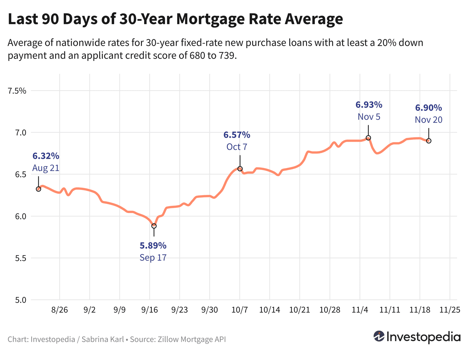 Les taux d’intérêt sur les nouveaux prêts hypothécaires à l’achat sur 30 ans ont chuté d’un point de base supplémentaire mercredi, après avoir légèrement baissé mardi. Cela ramène la moyenne supérieure à 6,90 %, toujours proche du pic de 6,93 % de début novembre, le plus cher depuis le 3 juillet. Le taux est désormais d’environ 1 point de pourcentage plus élevé que le plus bas sur deux ans enregistré en septembre – lorsque la moyenne sur 30 ans est tombée à 5,89 %.