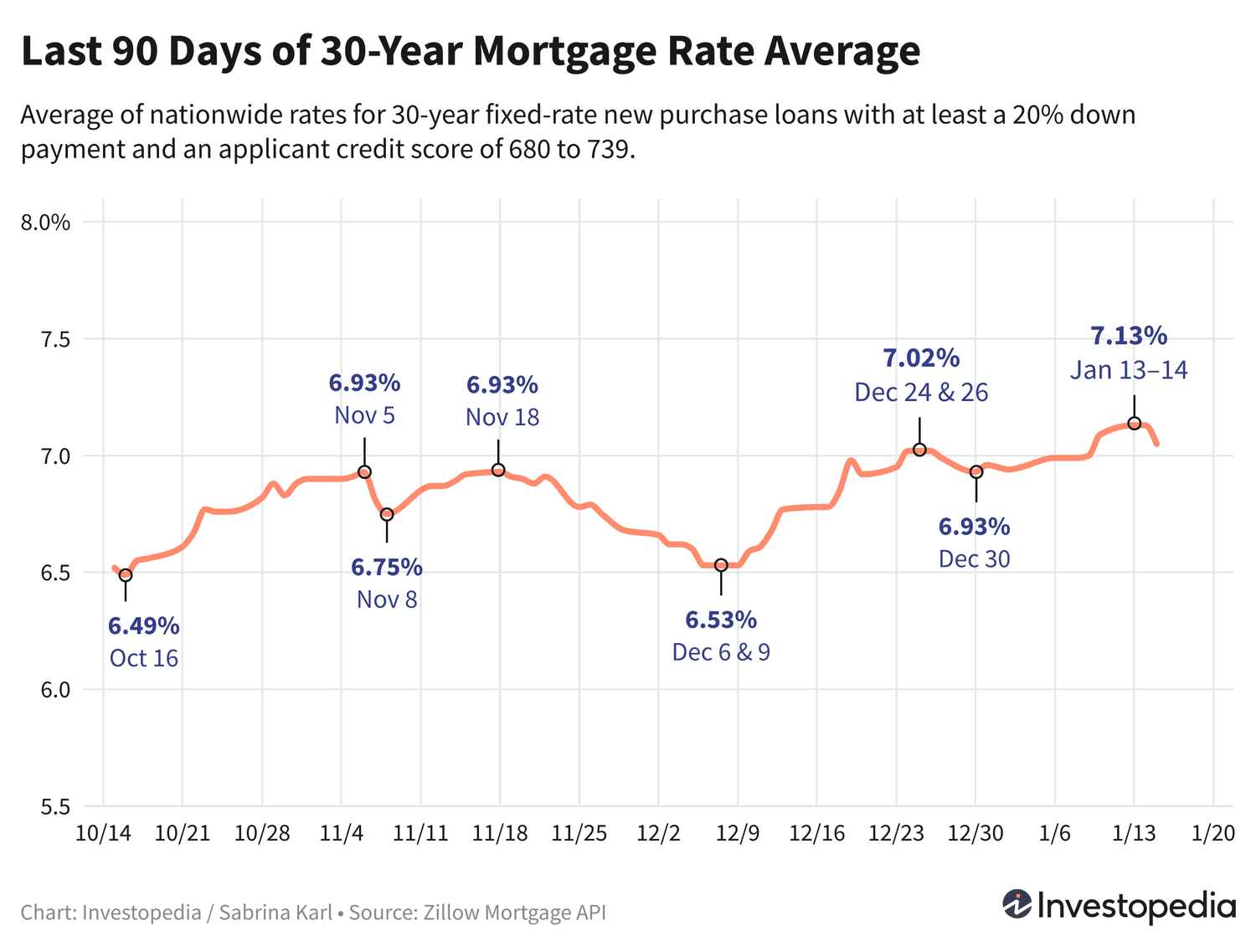 Chaque jeudi, Freddie Mac, acheteur de prêts hypothécaires soutenus par le gouvernement, publie le taux d’intérêt hebdomadaire moyen des prêts hypothécaires à 30 ans. Le chiffre d’aujourd’hui a ajouté 11 points de base supplémentaires à une moyenne hebdomadaire de 7,04 %, après une augmentation de 8 points de base au cours des deux semaines précédentes. Pas plus tard que le 26 septembre, la moyenne était en baisse de 6,08 %. Cependant, en octobre 2023, le taux d’intérêt moyen de Freddie Mac a connu une augmentation historique, atteignant son plus haut niveau depuis 23 ans de 7,79 %.