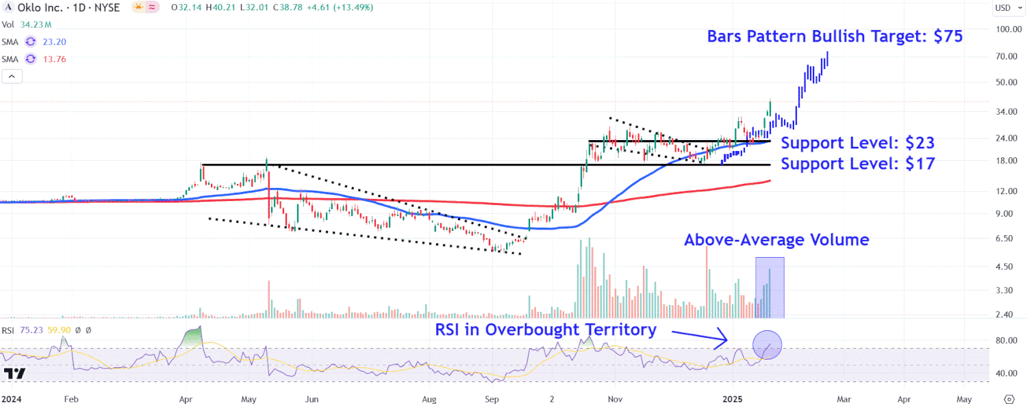 - Les investisseurs devraient surveiller les niveaux de support clés sur le graphique d’Oklo autour de 23 et 17 dollars.