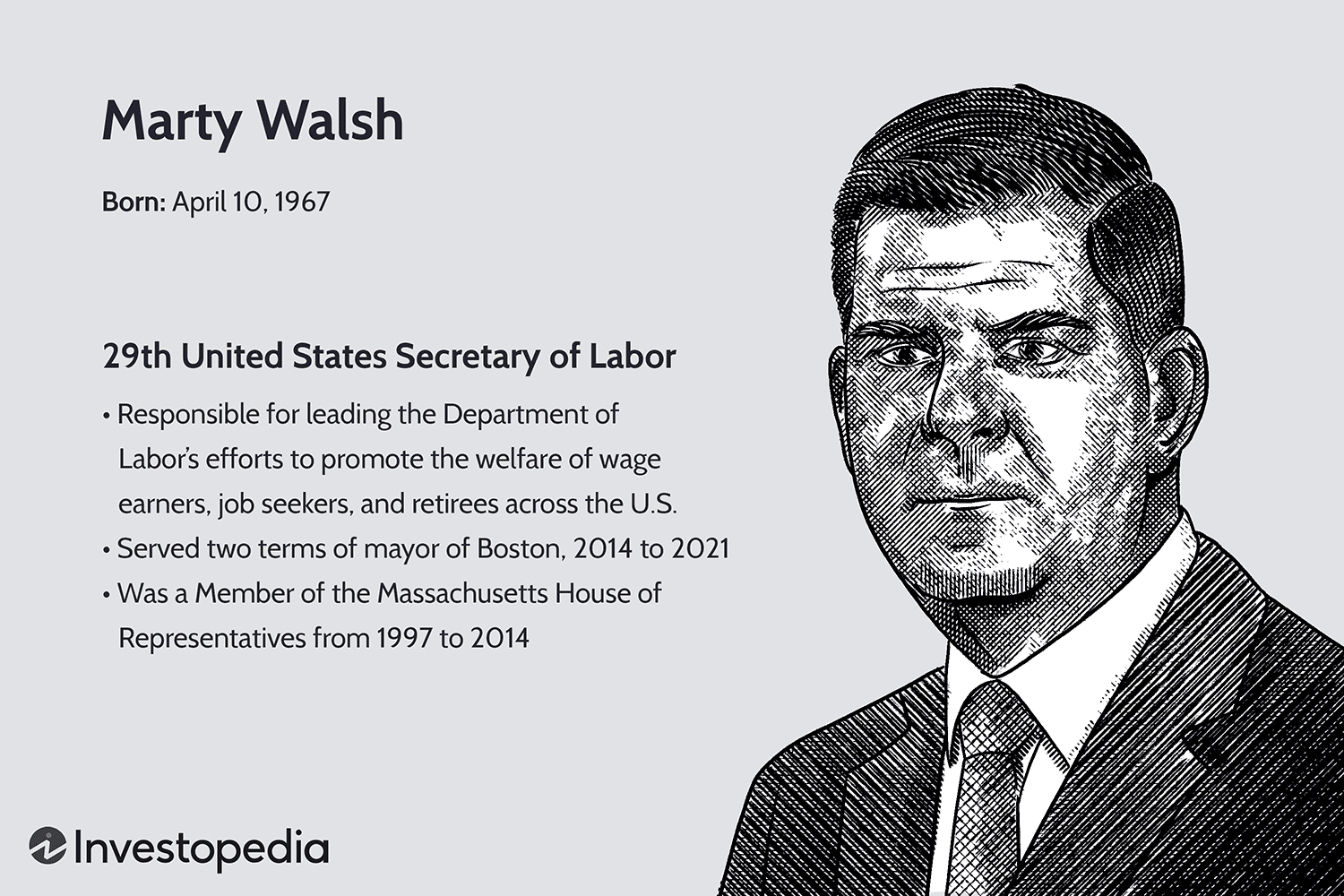 En tant que secrétaire américain au Travail, Marty Walsh a dirigé les efforts du ministère du Travail (DOL) pour promouvoir le bien-être des salariés, des demandeurs d’emploi et des retraités à travers les États-Unis. Cela comprend l’administration et l’application d’une série de lois sur le travail.