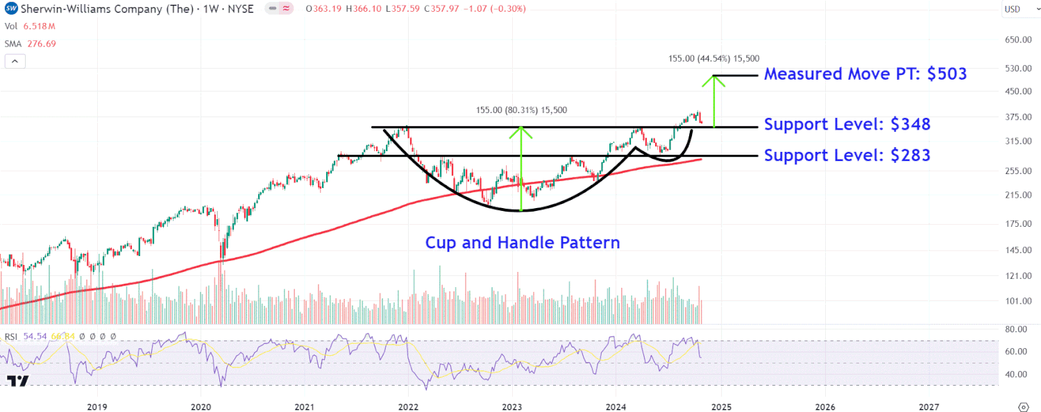 Depuis son sommet atteint fin 2021, l’action Sherwin-Williams a créé une tasse et une anse classiques, un modèle graphique haussier qui ressemble à une tasse avec une anse et signale la poursuite de la tendance haussière à long terme de l’action.