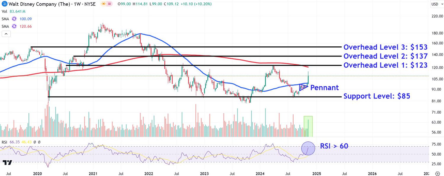 Si l’action Disney s’inverse, les investisseurs devraient surveiller 85 $. Cette position sur le graphique rencontrera probablement des achats près de la ligne horizontale pluriannuelle reliant le creux de la pandémie aux creux importants de décembre 2022 et d’août de cette année.