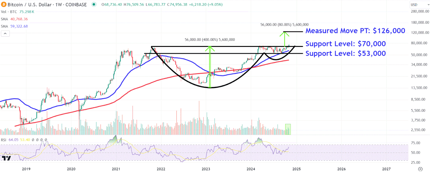 Cette technique basée sur un graphique fonctionne en calculant la profondeur de la partie « tasse » du motif de tasse et de poignée et en ajoutant cette profondeur à la ligne de tendance supérieure du motif. Dans ce cas, nous ajoutons 56 000 $ à 70 000 $, prédisant un objectif de mouvement mesuré de 126 000 $.