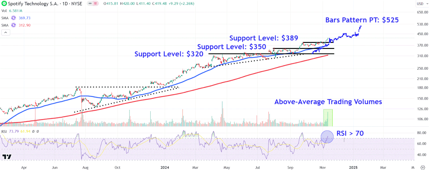 Projetons un objectif de prix à la hausse basé sur le graphique et identifions certains niveaux de négociation clés où l’action Spotify pourrait rencontrer un support lors d’un repli.