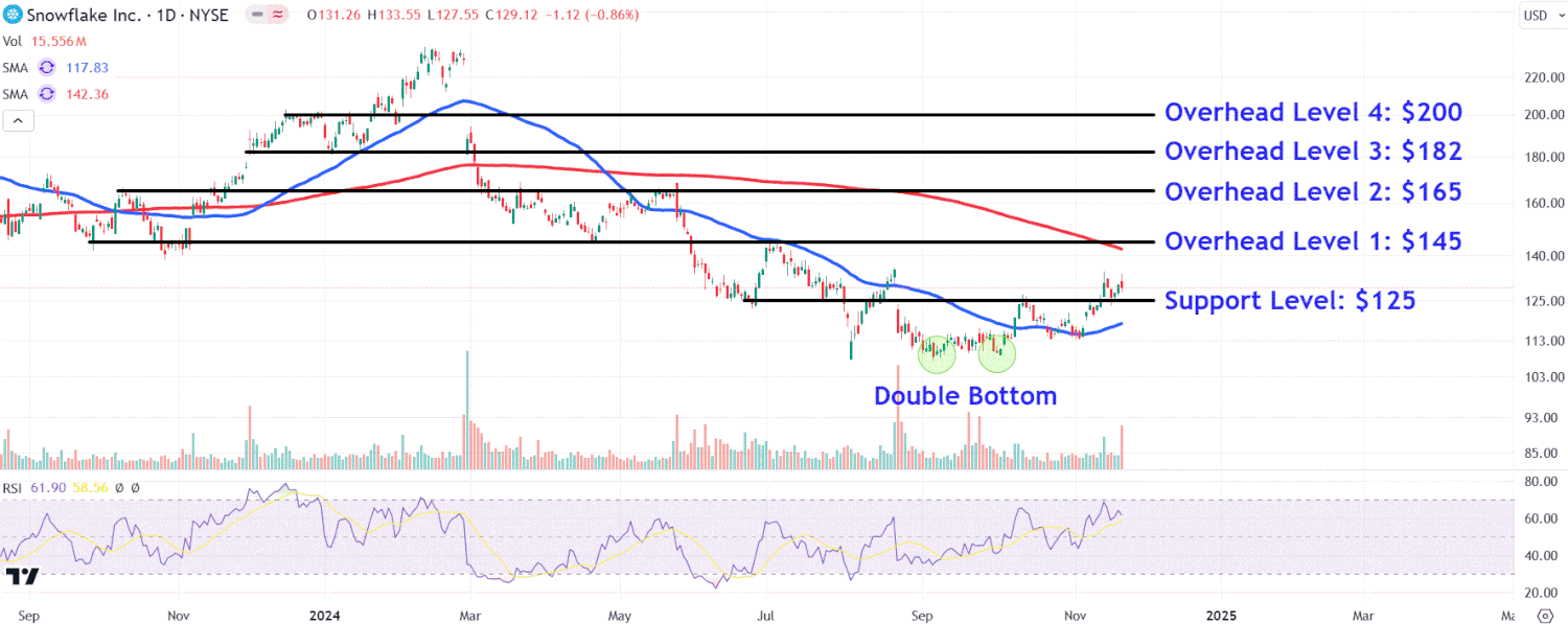 De septembre à octobre, l’action Snowflake a formé un double fond, une configuration graphique classique qui indique un renversement haussier.