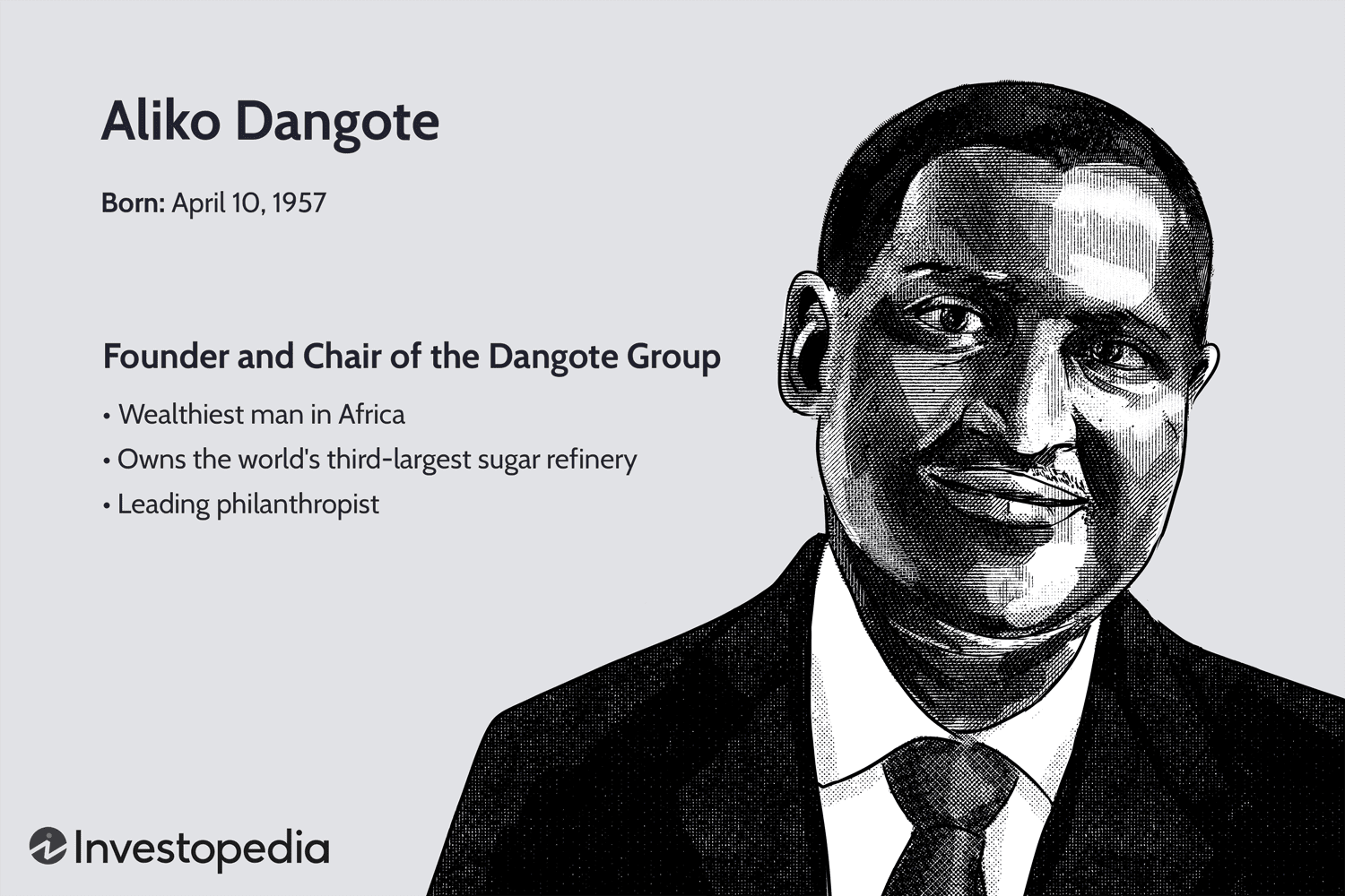 Aliko Dangote a fait fortune en important et en vendant des produits agricoles, puis du pétrole et du gaz, des biens de consommation et des produits manufacturés. La majorité des actifs de Dangote proviennent de Dangote Cement, présent dans 10 pays africains.