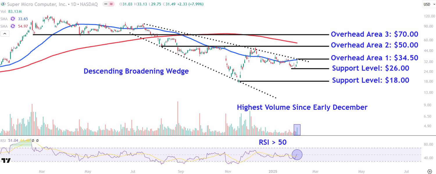 Ci-dessous, nous examinons de plus près le graphique de Supermicro et utilisons l’analyse technique pour identifier les niveaux de prix clés à noter.
