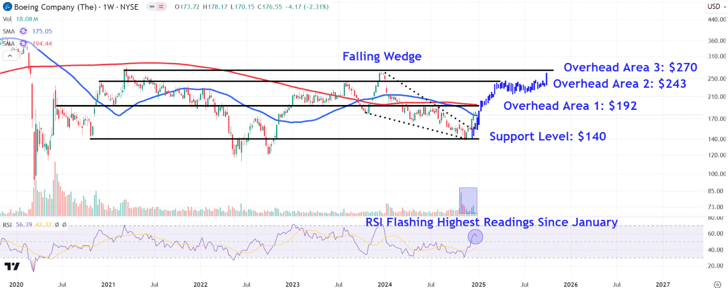 - Les investisseurs devraient surveiller les zones clés du graphique de Boeing autour de 192 dollars, 243 dollars et 270 dollars, tout en gardant un œil sur le support clé proche de 140 dollars.