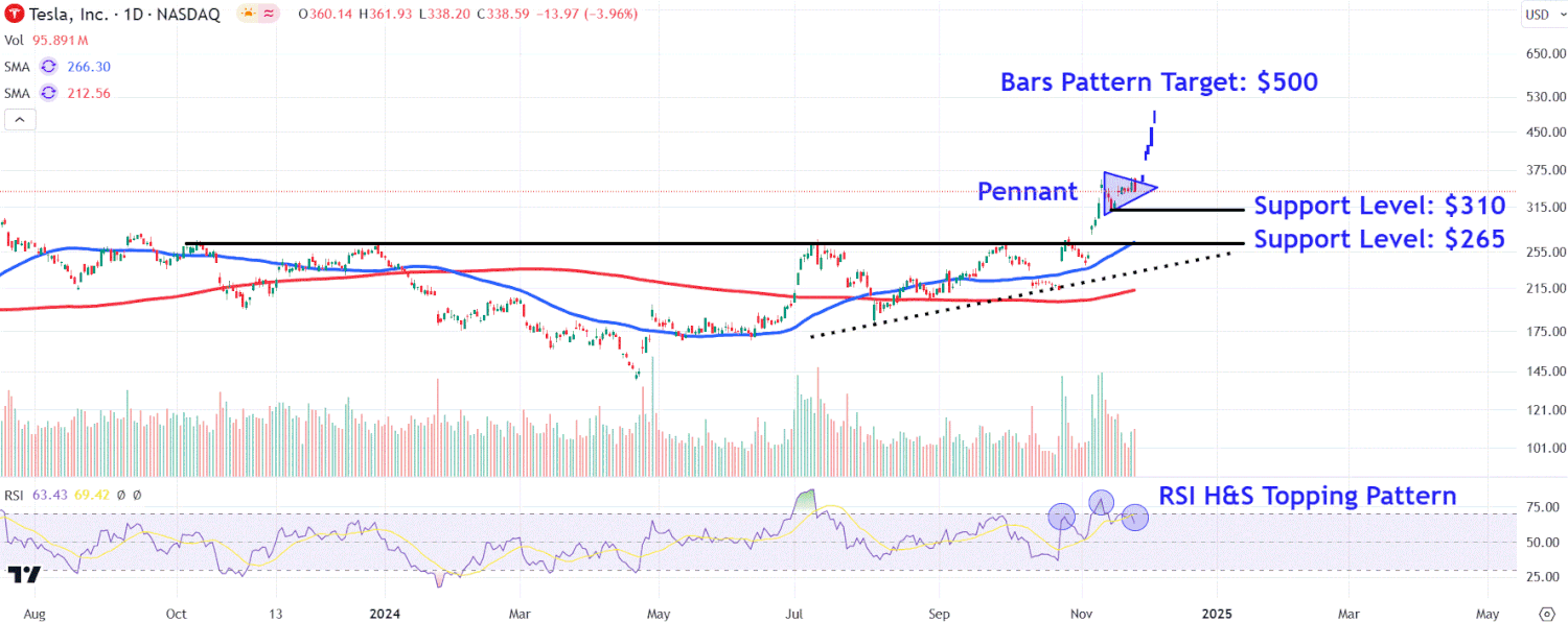 Après être sortie d’un triangle ascendant plus tôt ce mois-ci après la victoire électorale de Donald Trump, l’action Tesla a connu une tendance à la hausse pendant environ une semaine avant de se consolider sous forme de fanion, une configuration graphique signalant la poursuite de la tendance haussière actuelle de l’action.