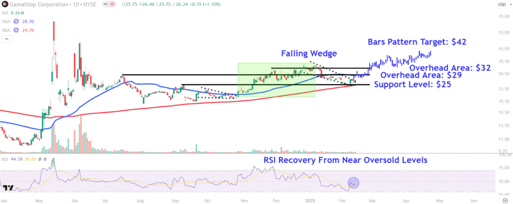 Depuis qu’elles ont atteint un sommet de sept mois début janvier, les actions GameStop se sont consolidées dans un coin descendant, une configuration graphique qui signale un mouvement au-dessus de la ligne de tendance supérieure de la formation.