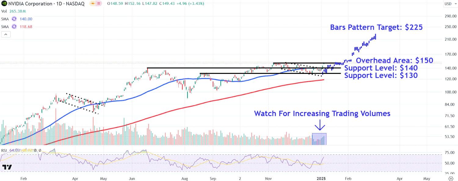 - Les investisseurs devraient surveiller les zones clés du graphique de Nvidia autour de 150 $ et 225 $, tout en gardant un œil sur les niveaux de support clés proches de 140 $ et 130 $.