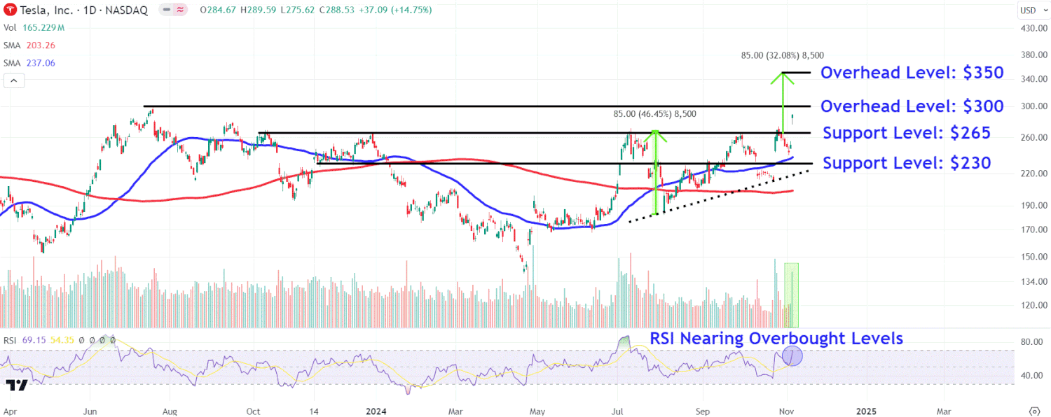 - Les investisseurs devraient garder un œil sur les niveaux de coûts clés sur le graphique de Tesla, autour de 300 et 350 dollars, tout en gardant un œil sur les zones de support clés proches de 265 et 230 dollars.