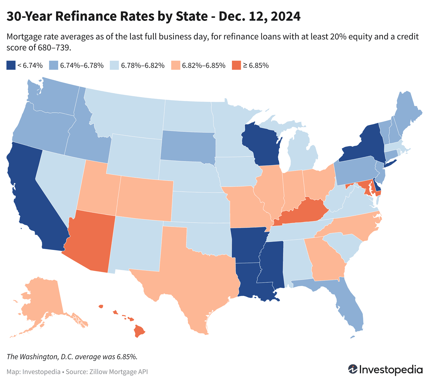 Pendant ce temps, les États avec les taux de refinancement les plus élevés mercredi étaient le Kentucky, Hawaï, le Maryland, l’Arizona et Washington, DC. La fourchette moyenne de refi sur 30 ans dans ces États est de 6,85 % à 6,90 %.