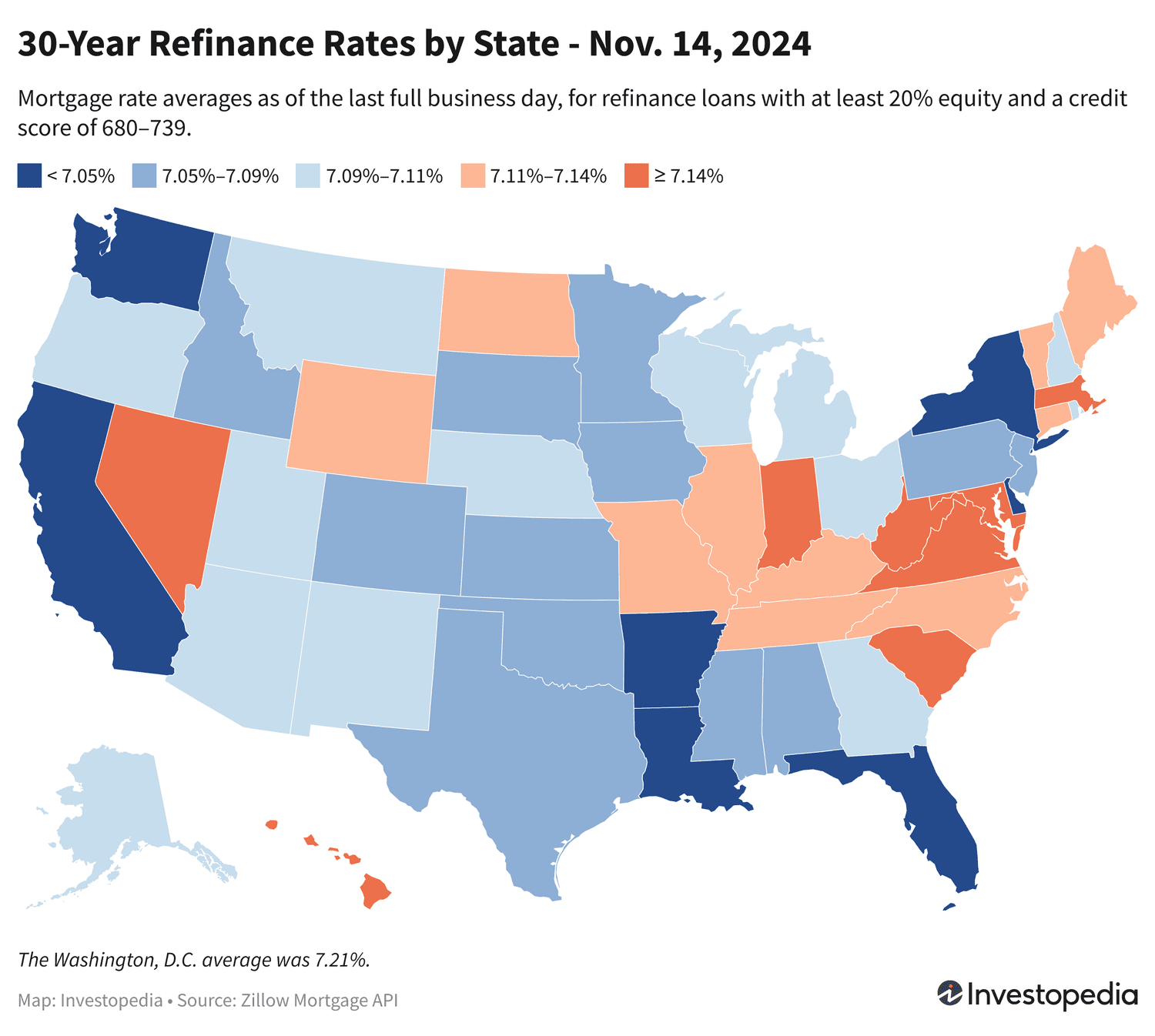 Pendant ce temps, les États avec les taux de refinancement les plus élevés mercredi étaient le Maryland, la Virginie, la Caroline du Sud, Washington, DC, la Virginie occidentale, le Massachusetts, Hawaï et le Nevada. La fourchette moyenne de refi sur 30 ans dans ces États est de 7,15 % à 7,22 %.