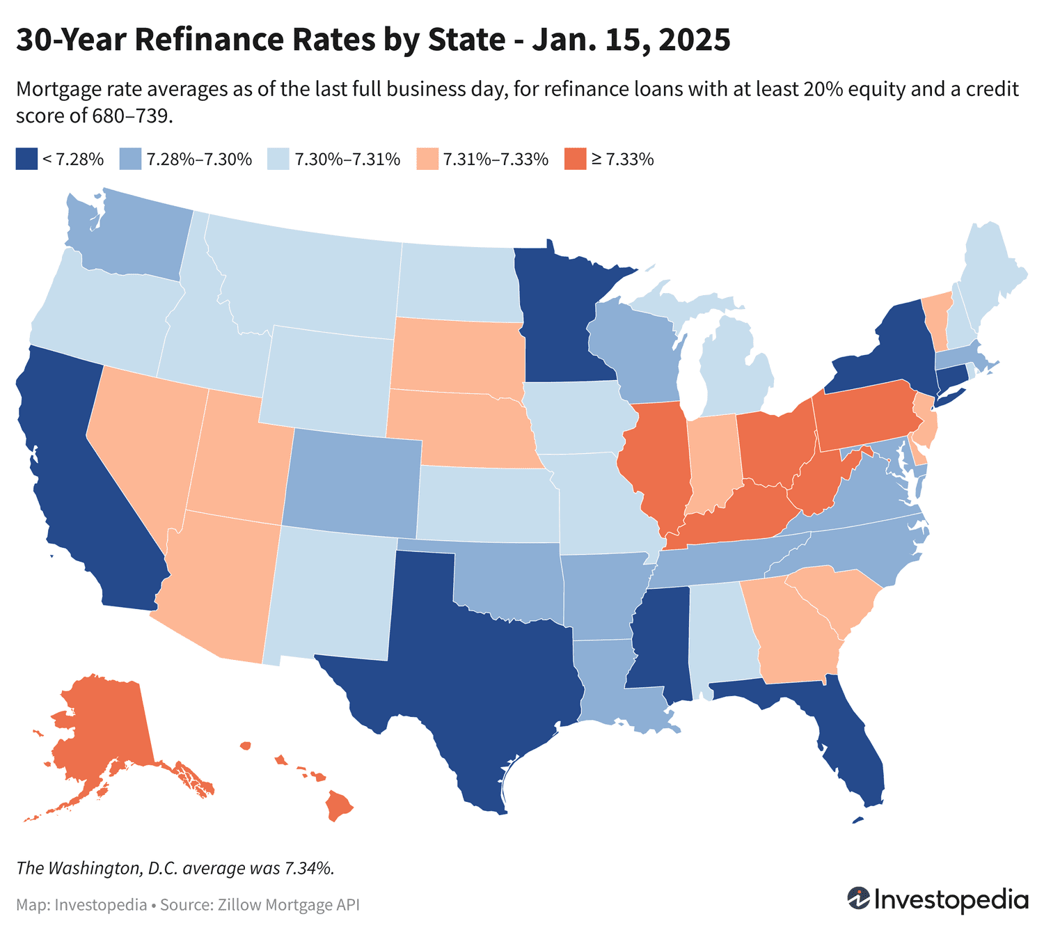 Pendant ce temps, les États avec les taux de refinancement les plus élevés mardi étaient Hawaï, le Kentucky, l’Alaska, Washington, DC, l’Illinois, l’Ohio, la Pennsylvanie et la Virginie occidentale. La fourchette moyenne de refi sur 30 ans dans ces États est de 7,33 % à 7,35 %.