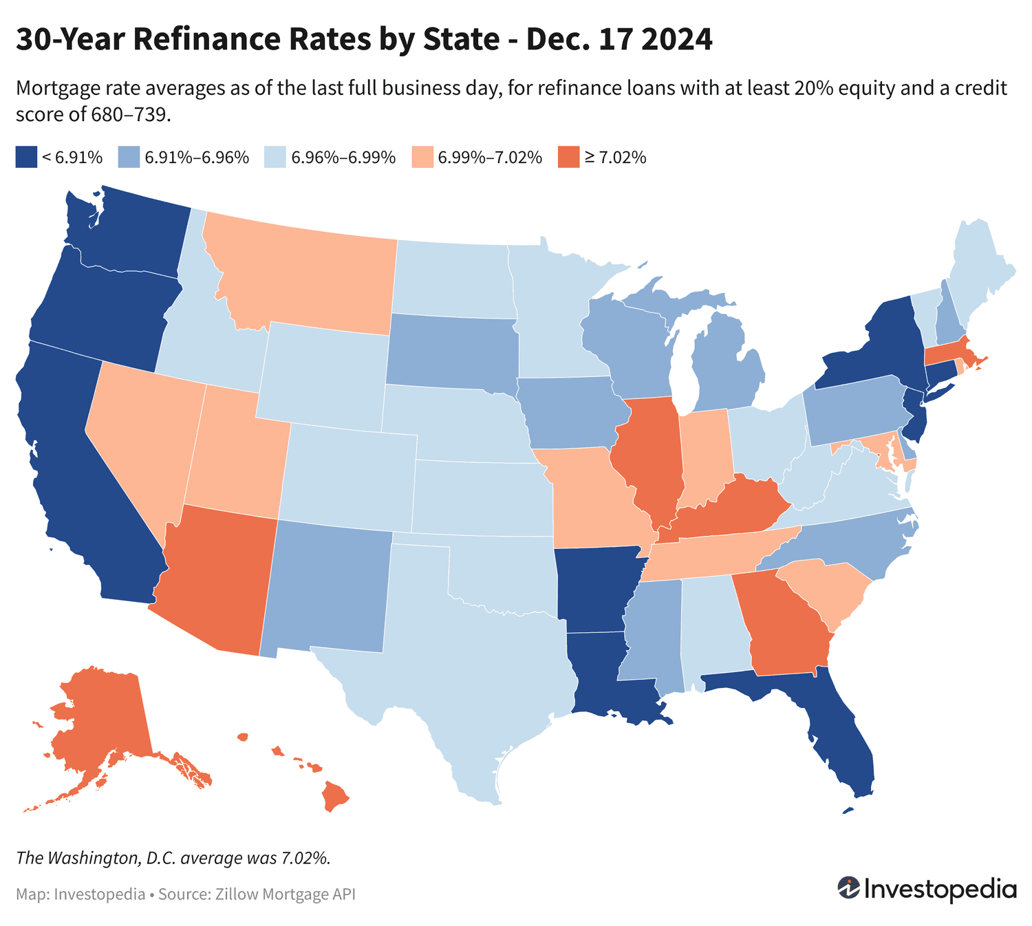 Pendant ce temps, les États avec les taux de refinancement les plus élevés lundi étaient le Kentucky, Hawaï, l’Illinois, l’Arizona, la Géorgie, l’Alaska, le Massachusetts et Washington, DC. La fourchette moyenne des taux de refinancement sur 30 ans pour ces États est de 7,02 % à 7,09 %.