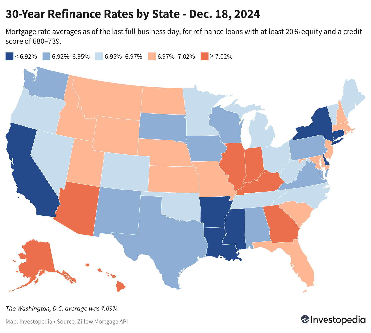 Pendant ce temps, les États avec les taux de refinancement les plus élevés mardi étaient le Kentucky, Hawaï, l’Arizona, l’Illinois, l’Indiana, Washington, DC, l’Alaska et la Géorgie. La fourchette moyenne de refi sur 30 ans dans ces États est de 7,02 % à 7,09 %.