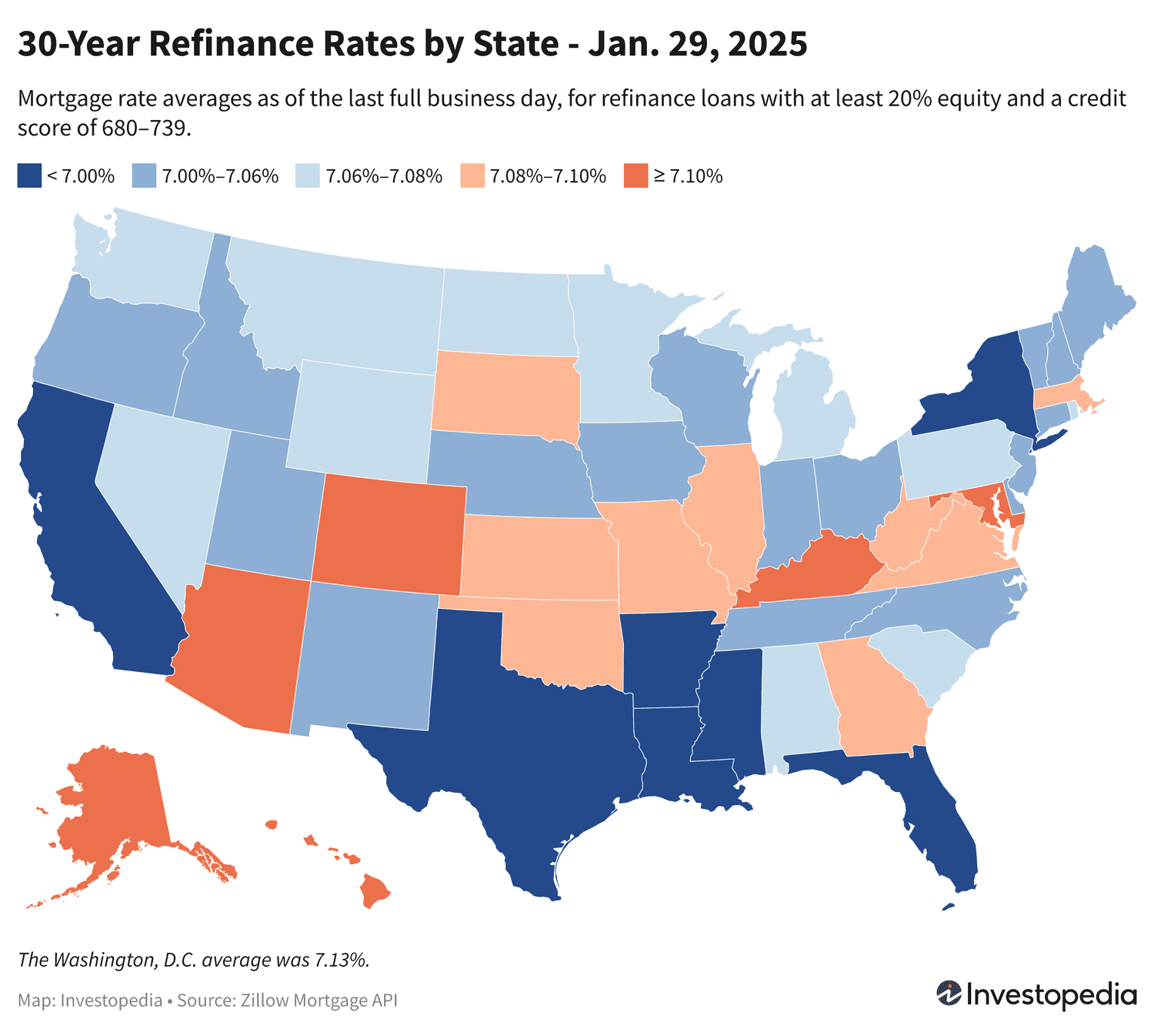 Pendant ce temps, les États avec les taux de refinancement les plus élevés mardi étaient le Kentucky, Hawaï, Washington, DC, l’Arizona, le Maryland, l’Alaska et le Colorado. La fourchette moyenne des refis à 30 ans pour ces derniers est de 7,10 % à 7,16 %.