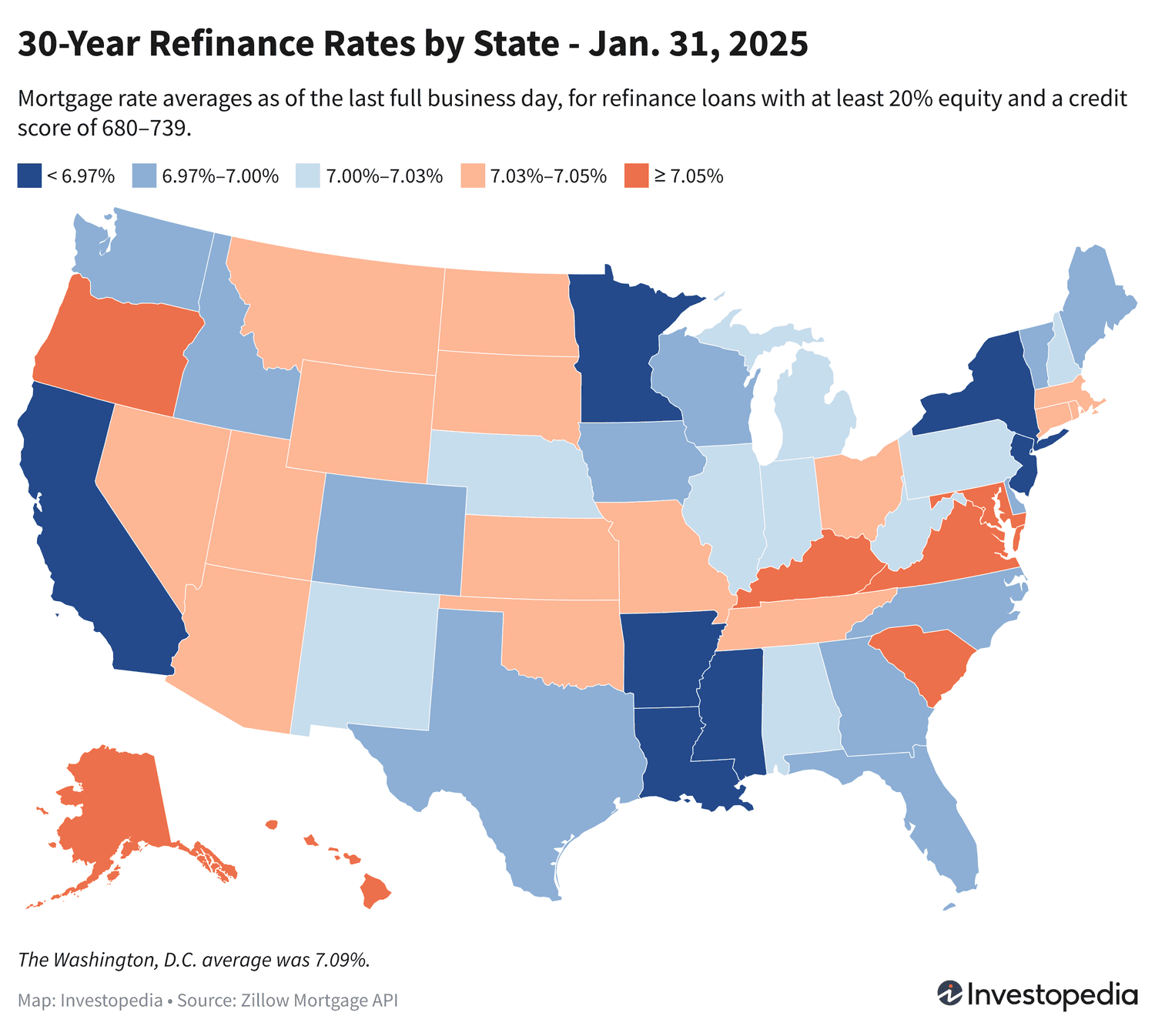 Pendant ce temps, les États avec les taux de refinancement les plus élevés jeudi étaient Hawaï, le Kentucky, Washington, DC, l’Alaska, le Maryland, l’Oregon, la Caroline du Sud et la Virginie. La fourchette moyenne des refis à 30 ans pour ces derniers est de 7,05 % à 7,11 %.