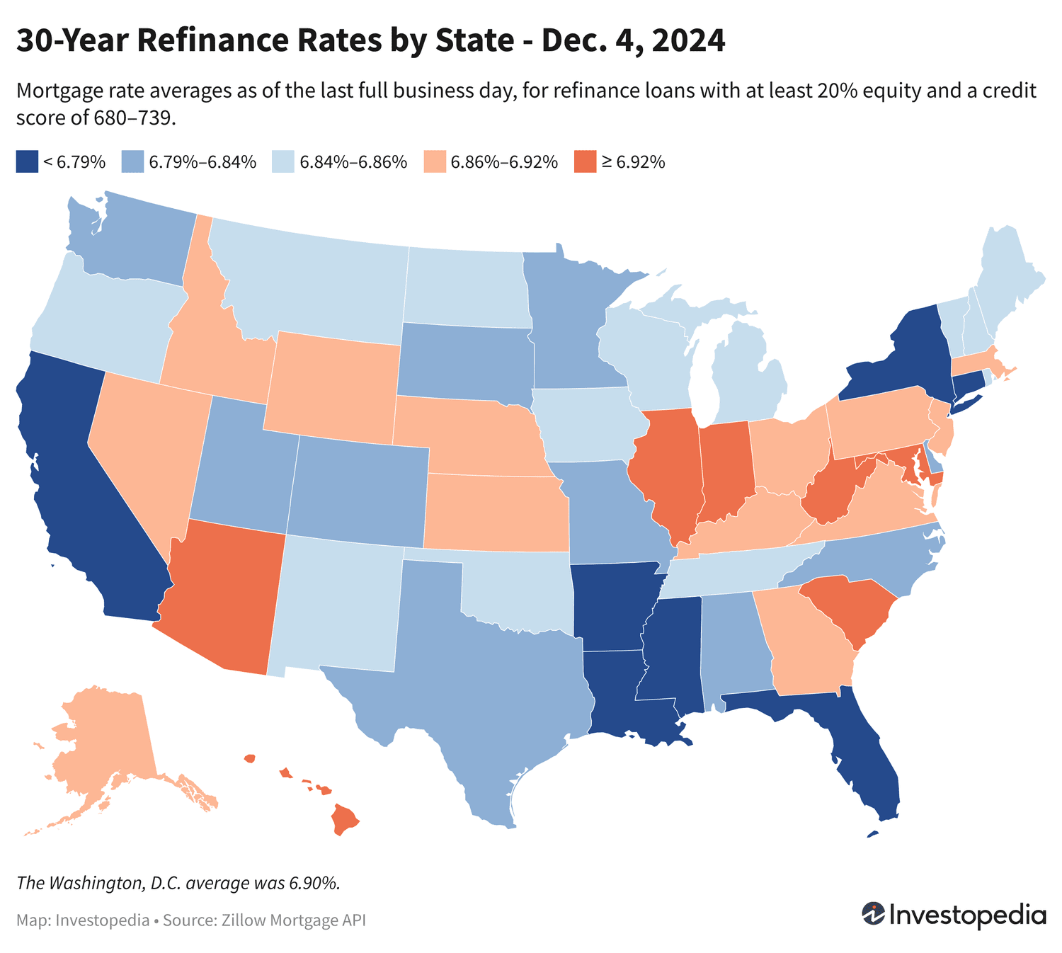 Pendant ce temps, les États avec les taux de refinancement les plus élevés mardi étaient l’Indiana, l’Arizona, Hawaï, le Maryland, la Caroline du Sud, l’Illinois et la Virginie occidentale. La fourchette moyenne de refi sur 30 ans dans ces États est de 6,92 % à 6,94 %.