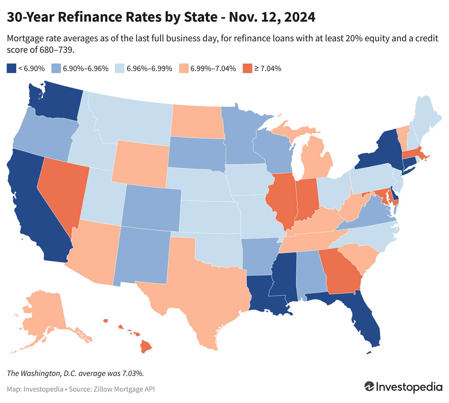 Vendredi, les États offrant les taux de refinancement hypothécaire sur 30 ans les moins chers étaient New York, la Californie, la Floride, le Connecticut, la Louisiane, le Mississippi, Washington et le Delaware. Huit États ont enregistré des moyennes refi sur 30 ans allant de 6,67 % à 6,89 %.