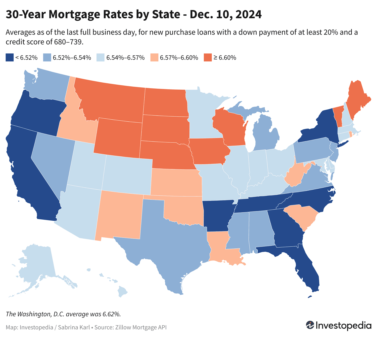 Les États offrant les taux hypothécaires neufs sur 30 ans les moins chers lundi étaient New York, la Californie, la Floride, la Géorgie, la Caroline du Nord, l’Oregon, l’Arkansas et le Tennessee. Huit États ont enregistré des moyennes allant de 6,29 % à 6,51 %.