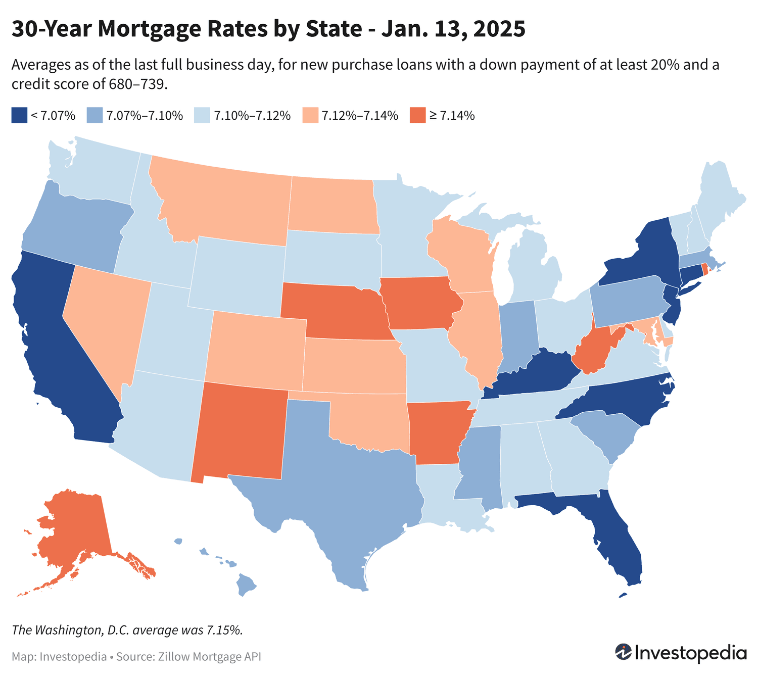Vendredi, les États offrant les taux hypothécaires neufs sur 30 ans les moins chers étaient New York, la Californie, la Floride, le Connecticut, le Kentucky, la Caroline du Nord et le New Jersey. Sept États ont enregistré des moyennes comprises entre 6,85 % et 7,06 %.