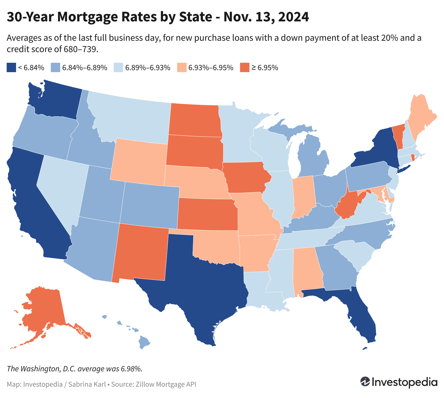 Les États offrant les taux hypothécaires neufs sur 30 ans les moins chers mardi étaient New York, la Californie, la Floride, Washington et le Texas. Cinq États ont enregistré des moyennes comprises entre 6,69 % et 6,83 %.