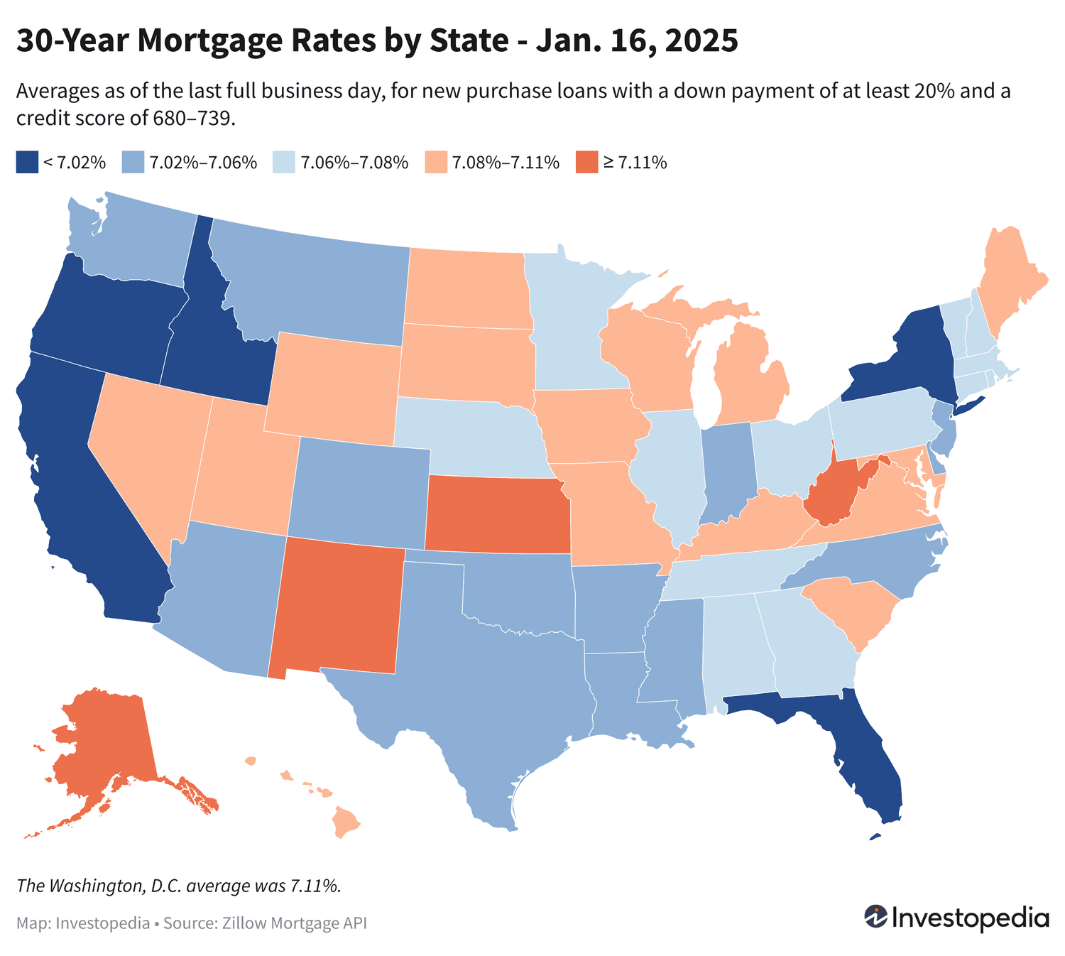 Pendant ce temps, les États avec les moyennes les plus élevées mercredi étaient la Virginie occidentale, l’Alaska, le Nouveau-Mexique, le Kansas, Washington, D.C. et le Dakota du Nord. La fourchette de la moyenne sur 30 ans dans ces États est de 7,10 % à 7,13 %.