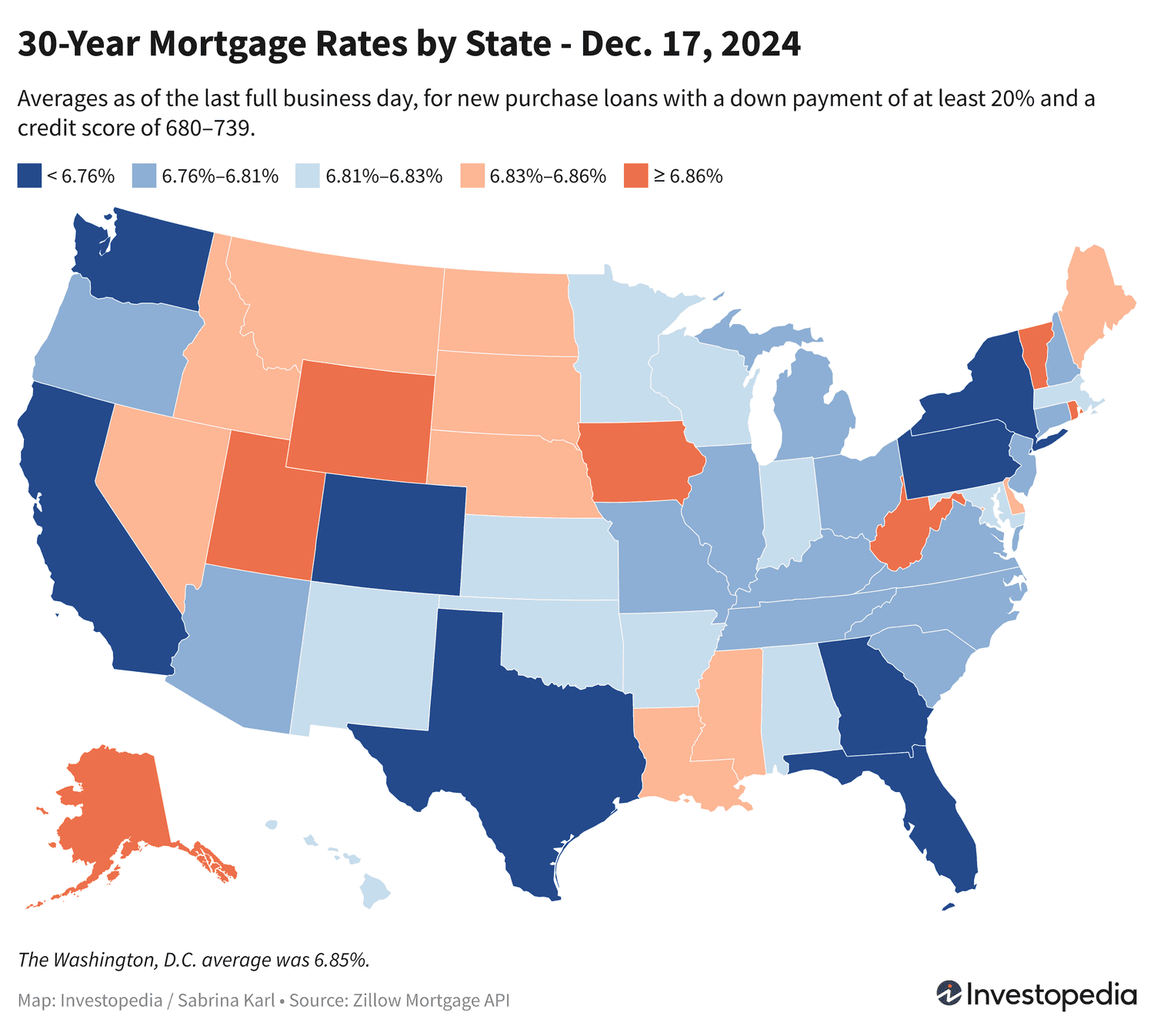 Lundi, les États offrant les taux hypothécaires neufs sur 30 ans les moins chers étaient New York, la Californie, la Floride, Washington, le Texas, le Colorado, la Géorgie et la Pennsylvanie. Huit États ont enregistré des moyennes comprises entre 6,65 % et 6,75 %.
