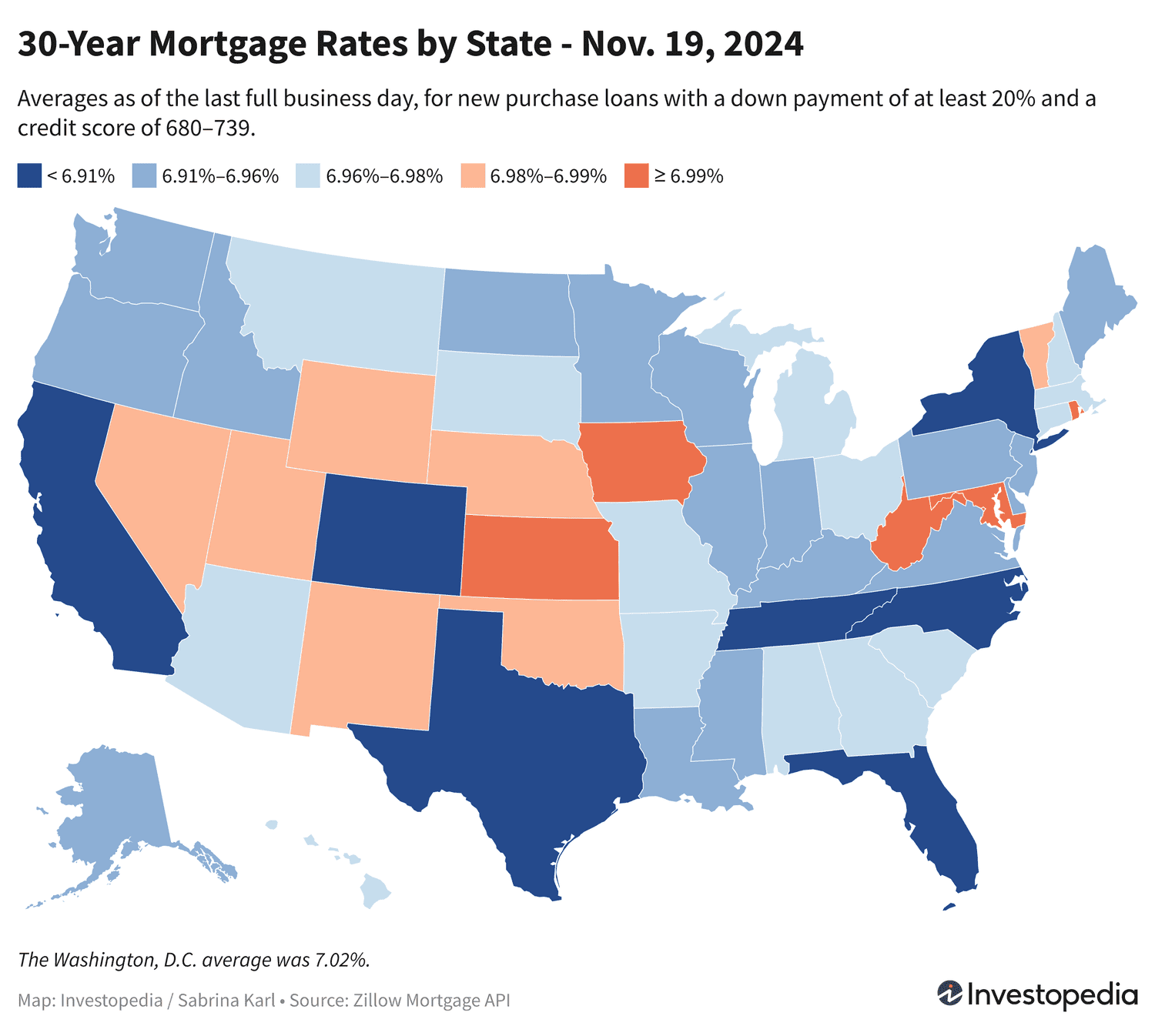 Les États offrant les taux hypothécaires neufs sur 30 ans les moins chers lundi étaient New York, la Californie, la Floride, la Caroline du Nord, le Texas, le Colorado et le Tennessee. Sept États ont enregistré des moyennes comprises entre 6,74 % et 6,90 %.